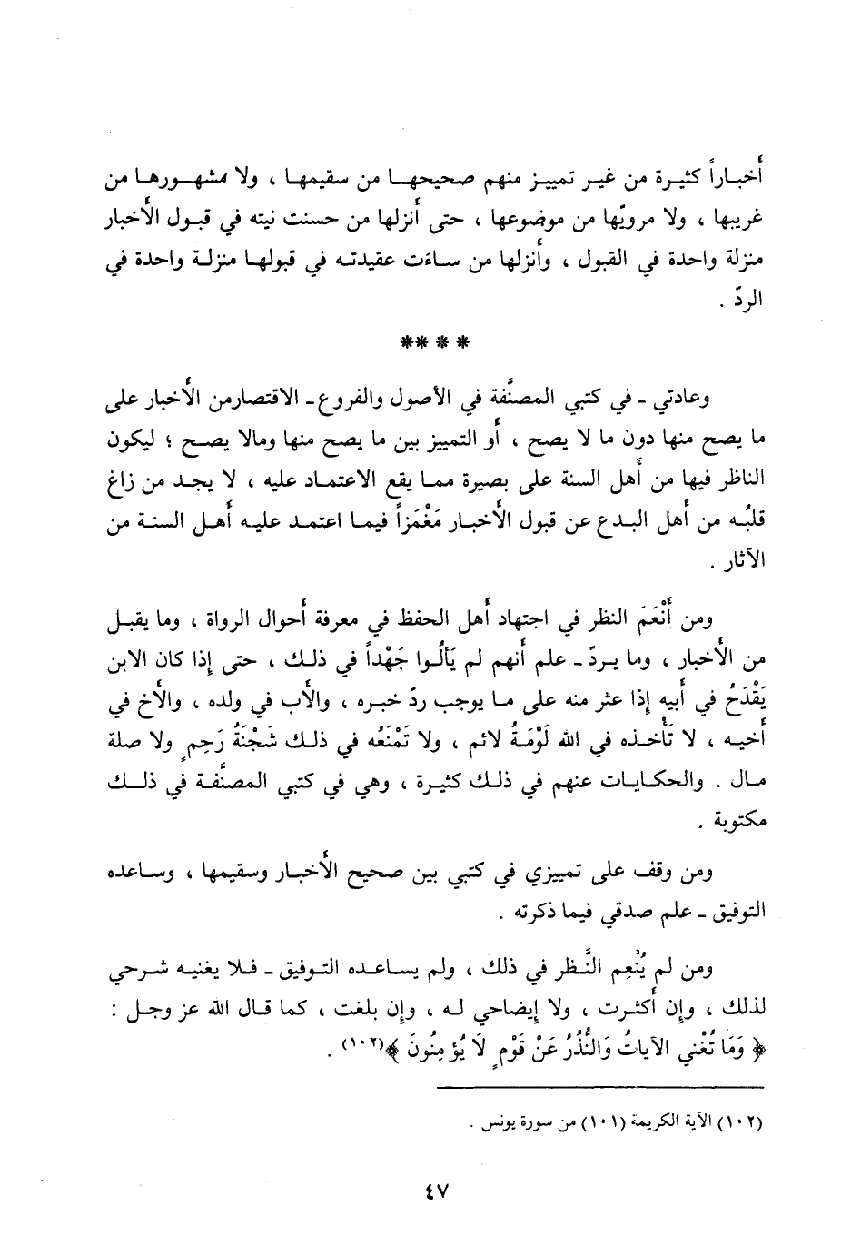 وعادتي- في كتبي المصنّفة في الأصول والفروع- الاقتصار من الأخبار على ما يصح منها دون ما لا يصح، أو التمييز بين ما يصح منها وما لا يصح، ليكون الناظر فيها من أهل السنة على بصيرة مما يقع الاعتماد عليه، لا يجد من زاغ قلبه من أهل البدع عن قبول الأخبار مغمزا فيما اعتمد عليه أهل السنة من الآثار.