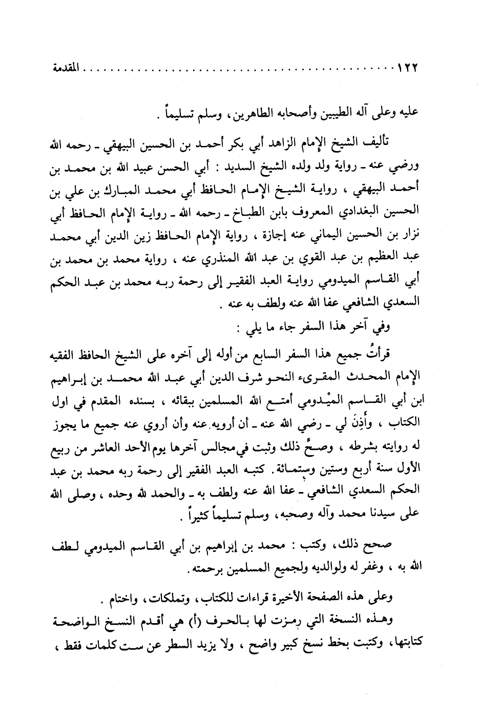 تأليف الشيخ الإمام الزاهد أبي بَكْرٍ أَحْمَدُ بْنُ الْحُسَيْنِ البيهقي- رحمه الله ورضي عنه- رواية ولد ولده الشيخ السديد: أبي الحسن عُبَيْدُ اللهِ بْنُ مُحَمَّدِ بن أحمد البيهقي، رواية الشيخ الإمام الحافظ أبي محمد المبارك بْنُ عَلِيِّ بْنِ الْحُسَيْنِ البغدادي المعروف بابن الطباخ- رحمه الله- رواية الإمام الحافظ أبي نزار بن الحسين اليماني عنه إجازة، رواية الإمام الحافظ زين الدين أبي محمد عبد العظيم بن عبد القوي بن عبد الله المنذري عنه، رواية محمد بن محمد بن أبي القاسم الميدومي رواية العبد الفقير إلى رحمة ربه محمد بن عبد الحكم السعدي الشافعي عفا الله عنه ولطف به عنه.