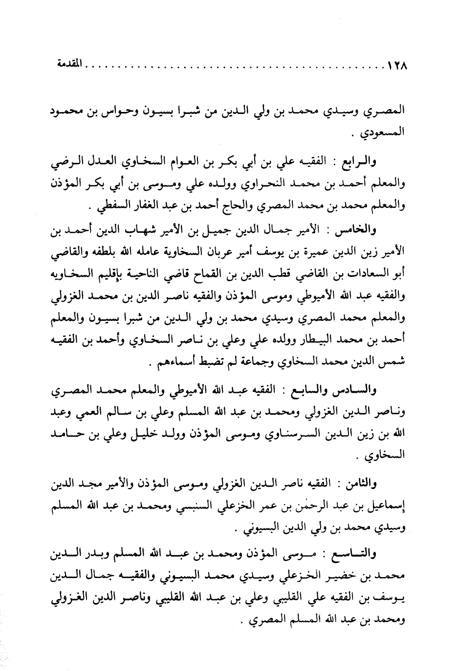 والخامس: الأمير جمال الدين جميل بن الأمير شهاب الدين أحمد بن الأمير زين الدين عميرة بن يوسف أمير عربان السخاوية عامله الله بلطفه والقاضي أبو السعادات بن القاضي قطب الدين بن القماح قاضي الناحية بإقليم السخاوية والفقيه عبد الله الأميوطي وموسى المؤذن والفقيه ناصر الدين بن محمد الغزولي والمعلم محمد المصري وسيدي محمد بن ولي الدين من شبرا بسيون والمعلم أحمد بن محمد البيطار وولده علي وعلي بن ناصر السخاوي وأحمد بن الفقيه شمس الدين محمد السخاوي وجماعة لم تضبط أسماءهم.