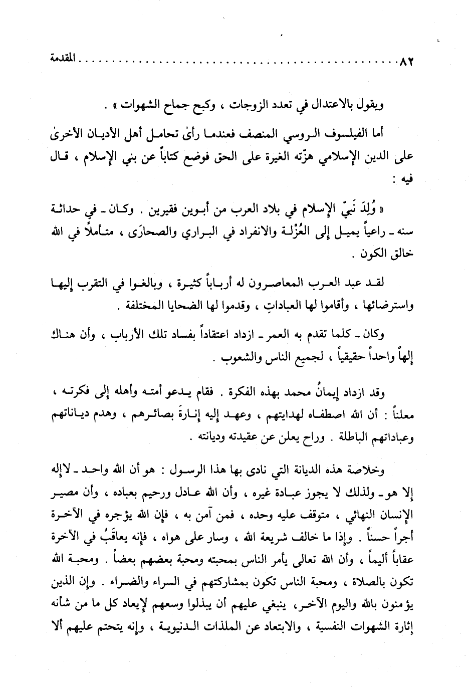 أما الفيلسوف الروسي المنصف فعند ما رأى تحامل أهل الأديان الأخرى على الدين الإسلامي هزّته الغيرة على الحق فوضع كتابا عن بني الإسلام، قال فيه: