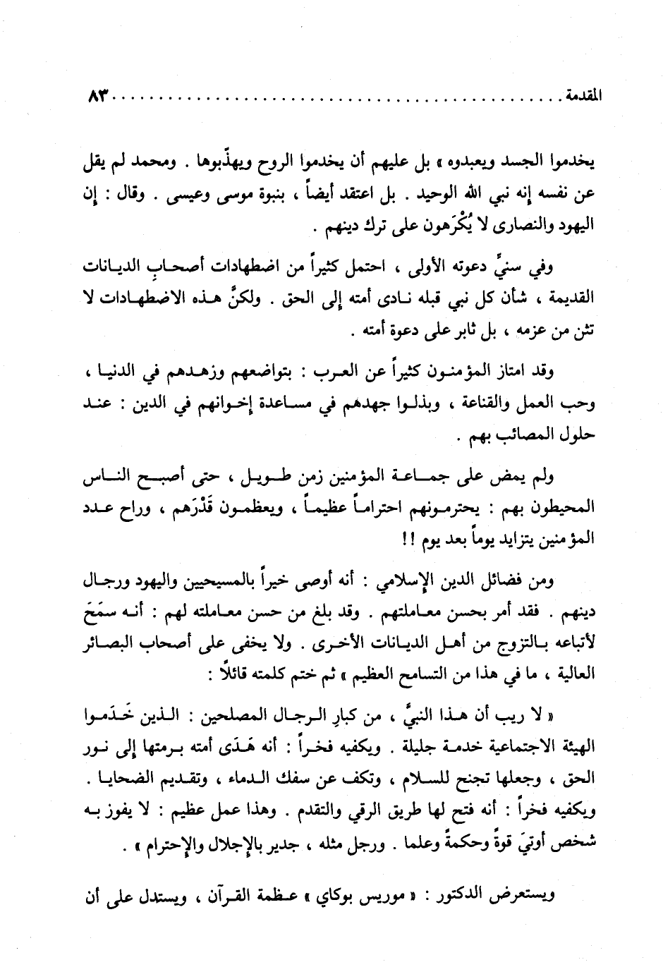 يخدموا الجسد ويعبدوه» بل عليهم أن يخدموا الروح ويهذّبوها. ومحمد لم يقل عن نفسه إنه نبي الله الوحيد. بل اعتقد أيضا، بنبوة موسى وعيسى. وقال: إن اليهود والنصارى لا يكرهون على ترك دينهم.