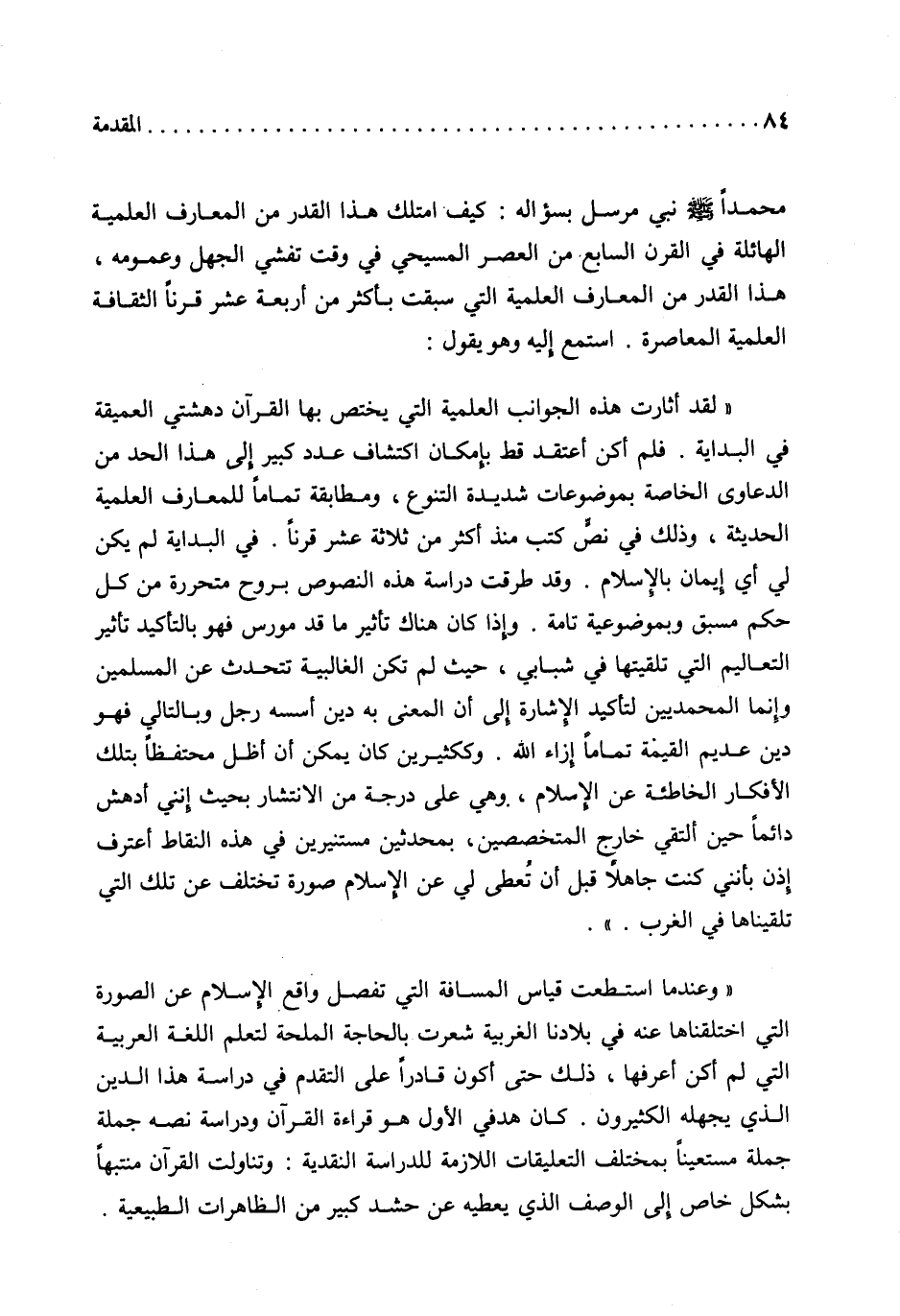 «وعند ما استطعت قياس المسافة التي تفصل واقع الإسلام عن الصورة التي اختلقناها عنه في بلادنا الغربية شعرت بالحاجة الملحة لتعلم اللغة العربية التي لم أكن أعرفها، ذلك حتى أكون قادرا على التقدم في دراسة هذا الدين الذي يجهله الكثيرون. كان هدفي الأول هو قراءة القرآن ودراسة نصه جملة جملة مستعينا بمختلف التعليقات اللازمة للدراسة النقدية: وتناولت القرآن منتبها بشكل خاص إلى الوصف الذي يعطيه عن حشد كبير من الظاهرات الطبيعية.