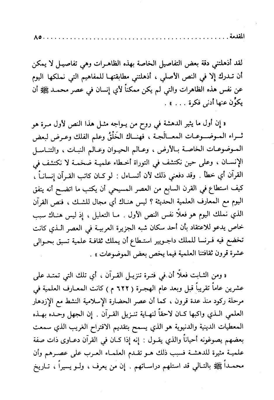 «ومن الثابت فعلا أن في فترة تنزيل القرآن، أي تلك التي تمتد على عشرين عاما تقريبا قبل وبعد عام الهجرة (622 م) كانت المعارف العلمية في مرحلة ركود منذ عدة قرون، كما أن عصر الحضارة الإسلامية النشط مع الازدهار العلمي الذي واكبها كان لاحقا لنهاية تنزيل القرآن. إن الجهل وحده بهذه المعطيات الدينية والدنيوية هو الذي يسمح بتقديم الاقتراح الغريب الذي سمعت بعضهم يصوغونه أحيانا والذي يقول: إنه إذا كان في القرآن دعاوى ذات صفة علمية مثيرة للدهشة فسبب ذلك هو تقدم العلماء العرب على عصرهم وَإِنَّ مُحَمَّدًا صَلَّى اللهُ عَلَيْهِ وسلّم بالتالي قد استلهم دراساتهم. إن من يعرف، ولو يسيرا، تاريخ