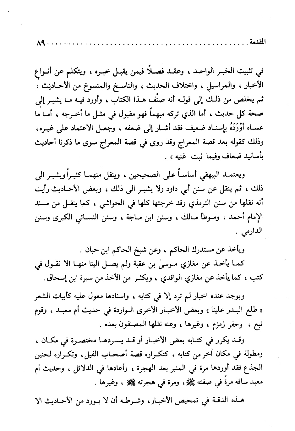 في تثبيت الخبر الواحد، وعقد فصلا فيمن يقبل خبره، ويتكلم عن أنواع الأخبار، والمراسيل، واختلاف الحديث، والناسخ والمنسوخ من الأحاديث، ثم يخلص من ذلك إلى قوله أنه صنّف هذا الكتاب، وأورد فيه ما يشير إلى صحة كل حديث، أما الذي تركه مبهما فهو مقبول في مثل ما أخرجه، أما ما عساه أورده بإسناد ضعيف فقد أشار إلى ضعفه، وجعل الاعتماد على غيره، وذلك كقوله بعد قصة المعراج وقد رُوِيَ فِي قِصَّةِ الْمِعْرَاجِ سِوَى مَا ذَكَرْنَا أَحَادِيثُ بِأَسَانِيدَ ضِعَافٍ وَفِيمَا ثبت غنية» .