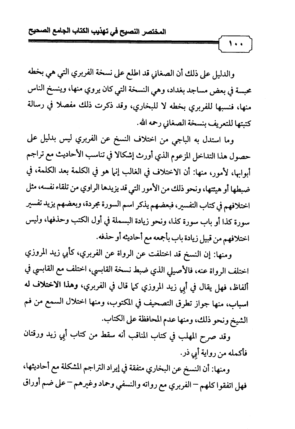 والدليل على ذلك أن الصغاني قد اطلع على نسخة الفربري التي هي بخطه محبسة في بعض مساجد بغداد، وهي النسخة التي كان يروي منها, وينسخ الناس منها، فنسبها للفربري بخطه لا للبخاري، وقد ذكرت ذلك مفصلا في رسالة كتبتها للتعريف بنسخة الصغاني رحمه الله.