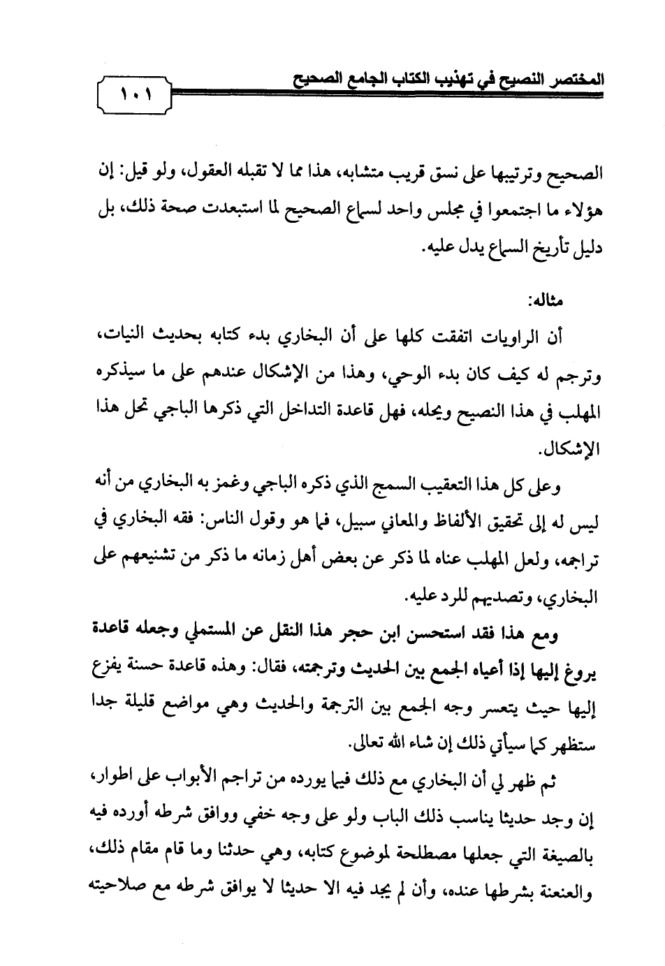 ومع هذا فقد استحسن ابن حجر هذا النقل عن المستملي وجعله قاعدة يروغ إليها إذا أعياه الجمع بين الحديث وترجمته، فقال: وهذه قاعدة حسنة يفزع إليها حيث يتعسر وجه الجمع بين الترجمة والحديث وهي مواضع قليلة جدا ستظهر كما سيأتي ذلك إن شاء الله تعالى.