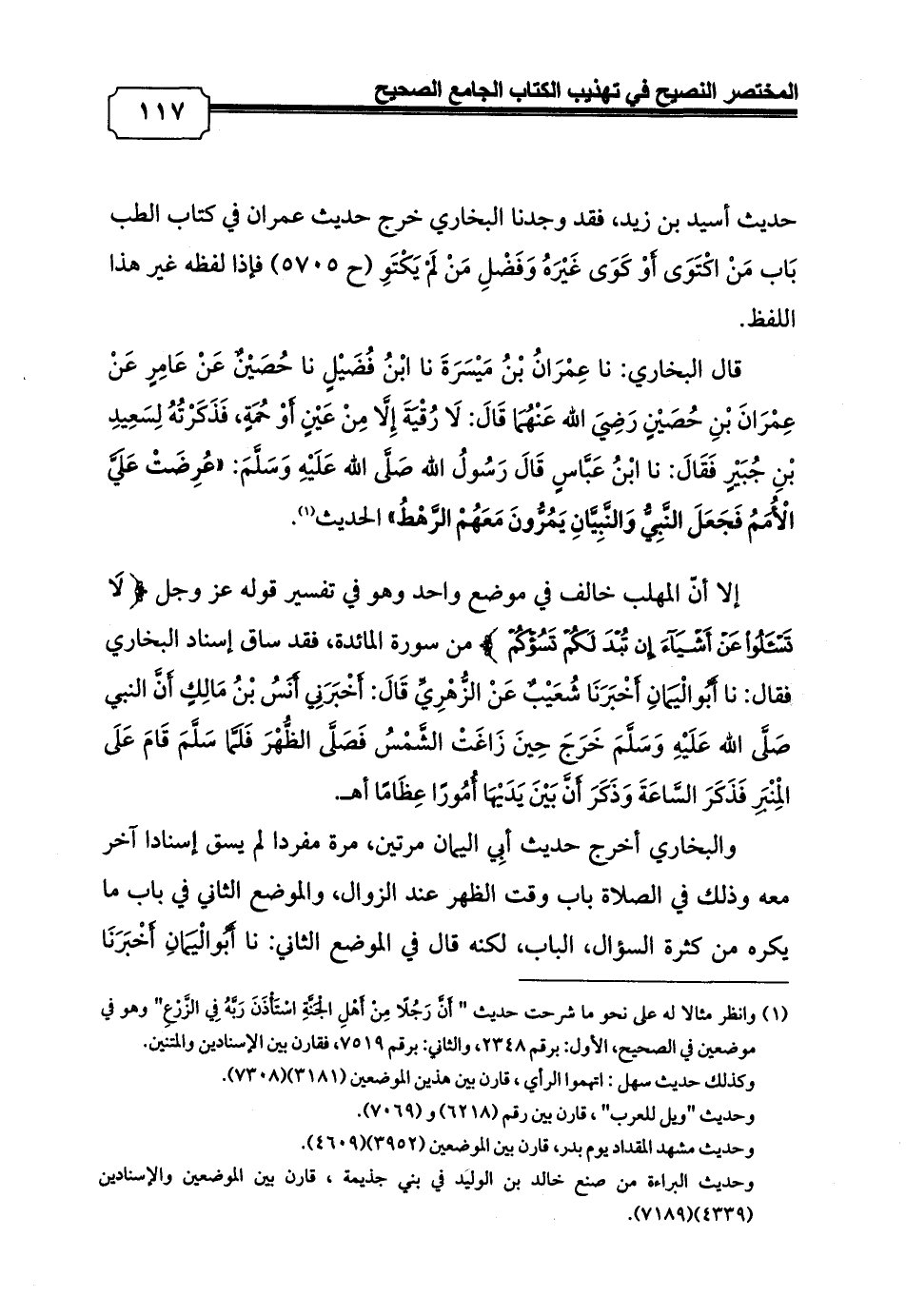 قال البخاري: نا عِمْرَانُ بْنُ مَيْسَرَةَ نا ابْنُ فُضَيْلٍ نا حُصَيْنٌ عَنْ عَامِرٍ عَنْ عِمْرَانَ بْنِ حُصَيْنٍ رَضِيَ الله عَنْهُمَا قَالَ: لَا رُقْيَةَ إِلَّا مِنْ عَيْنٍ أَوْ حُمَةٍ, فَذَكَرْتُهُ لِسَعِيدِ بْنِ جُبَيْرٍ فَقَالَ: نا ابْنُ عَبَّاسٍ قَالَ رَسُولُ الله صَلَّى الله عَلَيْهِ وَسَلَّمَ: «عُرِضَتْ عَلَيَّ الْأُمَمُ فَجَعَلَ النَّبِيُّ وَالنَّبِيَّانِ يَمُرُّونَ مَعَهُمْ الرَّهْطُ» الحديث (¬1).
