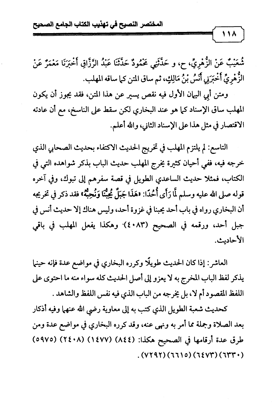 التاسع: لم يلتزم المهلب في تخريج الحديث الاكتفاء بحديث الصحابي الذي خرجه فيه، ففي أحيان كثيرة يخرج المهلب حديث الباب بذكر شواهده التي في الكتاب, فمثلا حديث الساعدي الطويل في قصة سفرهم إلى تبوك, وفي آخره قوله صلى الله عليه وسلم لَمَّا رَأَى أُحُدًا: «هَذَا جَبَلٌ يُحِبُّنَا وَنُحِبُّهُ» فقد ذكر في تخريجه أن البخاري رواه في باب أحد يحبنا في غزوة أحد, وليس هناك إلا حديث أنس في جبل أحد, ورقمه في الصحيح (4083) , وهكذا يفعل المهلب في باقي الأحاديث.