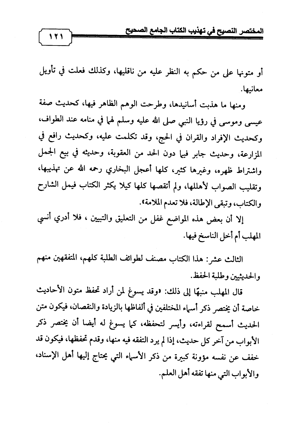 ومنها ما هذبت أسانيدها، وطرحت الوهم الظاهر فيها، كحديث صفة عيسى وموسى في رؤيا النبي صلى الله عليه وسلم لهما في منامه عند الطواف، وكحديث الإفراد والقران في الحج، وقد تكلمت عليه، وكحديث رافع في المزارعة، وحديث جابر فيما دون الحد من العقوبة، وحديثه في بيع الجمل واشتراط ظهره، وغيرها كثير، كلها أعجل البخاري رحمه الله عن تهذيبها, وتقليب الصواب لأهللها، ولم أتقصها كلها كيلا يكثر الكتاب فيمل الشارح والكتاب، وتبقى الإطالة, فلا تعدم الملامة».