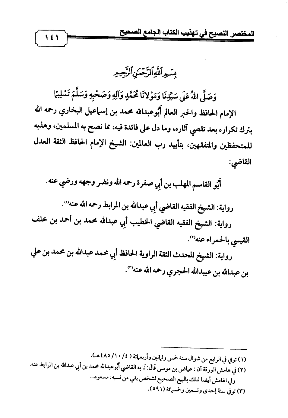 (*) الإمام الحافظ والحبر العالم أَبُوعبد الله محمد بن إسماعيل البخاري رحمه الله بترك تكراره بعد تقصي آثاره، وما دل على فائدة فيه، مما نصح به المسلمين، وهذبه للمتحفظين والمتفقهين، بتأييد رب العالمين: الشيخ الإمام الحافظ الثقة العدل القاضي: