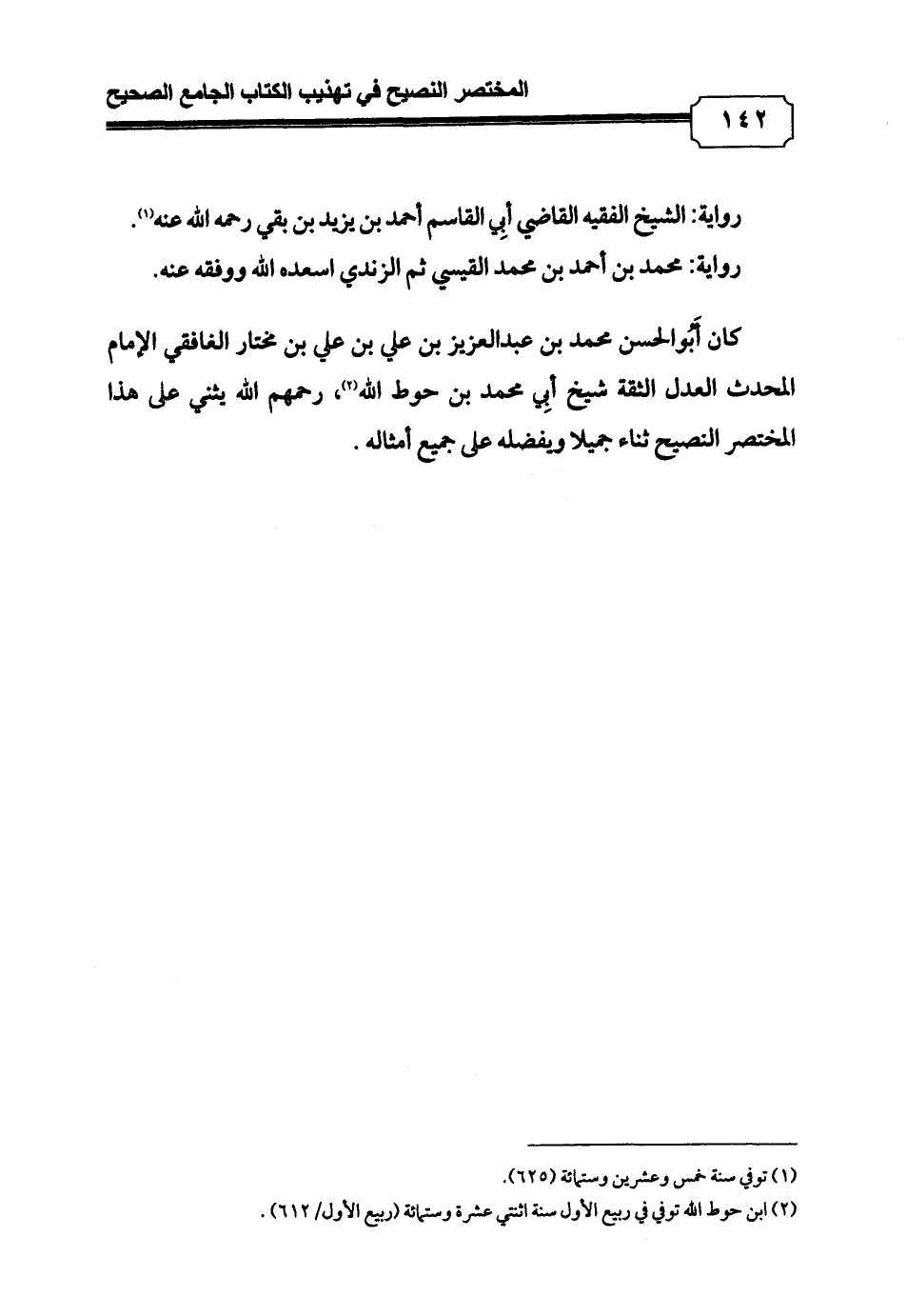 كان أَبُوالحسن محمد بن عبد العزيز بن علي بن علي بن مختار الغافقي الإمام المحدث العدل الثقة شيخ أبِي محمد بن حوط الله (¬3)، رحمهم الله يثني على هذا المختصر النصيح ثناء جميلا ويفضله على جميع أمثاله.