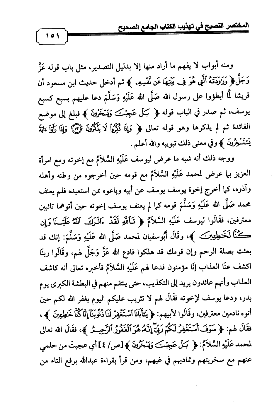 ووجه ذلك أنه شبه ما عرض ليوسف عَلَيْهِ السَّلاَمُ مع إخوته ومع امرأة العزيز بما عرض لمحمد عَلَيْهِ السَّلاَمُ مع قومه حين أخرجوه من وطنه وأهله وآذوه، كما أخرج إخوة يوسف يوسف عن أبيه وباعوه ممن استعبده فلم يعنف محمد صَلَّى الله عَلَيْهِ وَسَلَّمَ قومه كما لم يعنف يوسف إخوته حين أتوهما تائبين معترفين، فقَالَوا ليوسف عَلَيْهِ السَّلاَمُ {تَاللَّهِ لَقَدْ آثَرَكَ اللَّهُ عَلَيْنَا وَإِنْ كُنَّا لَخَاطِئِينَ} , وقَالَ أَبُوسفيان لمحمد صَلَّى الله عَلَيْهِ وَسَلَّمَ: إنك قد بعثت بصلة الرحم وإن قومك قد هلكوا فادع الله عَزَّ وَجَلَّ لهم, وقَالَوا ربنَا اكشف عنَا العذاب إنَا مؤمنون فدعا لهم عَلَيْهِ السَّلاَمُ فأخبره تعالى أنه كاشف العذاب وأنهم عائدون يريد إلى التكذيب، حتى ينتقم منهم في البطشة الكبرى يوم بدر، ودعا يوسف لإخوته فقَالَ لهم لا تثريب عليكم اليوم يغفر الله لكم حين أتوه نادمين معترفين، وقَالَوا لأبيهم: {يَاأَبَانَا اسْتَغْفِرْ لَنَا ذُنُوبَنَا إِنَّا كُنَّا خَاطِئِينَ}، فقَالَ لهم: {سَوْفَ أَسْتَغْفِرُ لَكُمْ رَبِّي إِنَّهُ هُوَ الْغَفُورُ الرَّحِيمُ} , فقَالَ الله تعالى لمحمد عَلَيْهِ السَّلاَمُ: {بَلْ عَجِبْتَ وَيَسْخَرُونَ} [ص/4] أي عجبتَ من حلمي عنهم مع سخريتهم وتماديهم في غيهم، ومن قرأ بقراءة عبد الله برفع التاء من