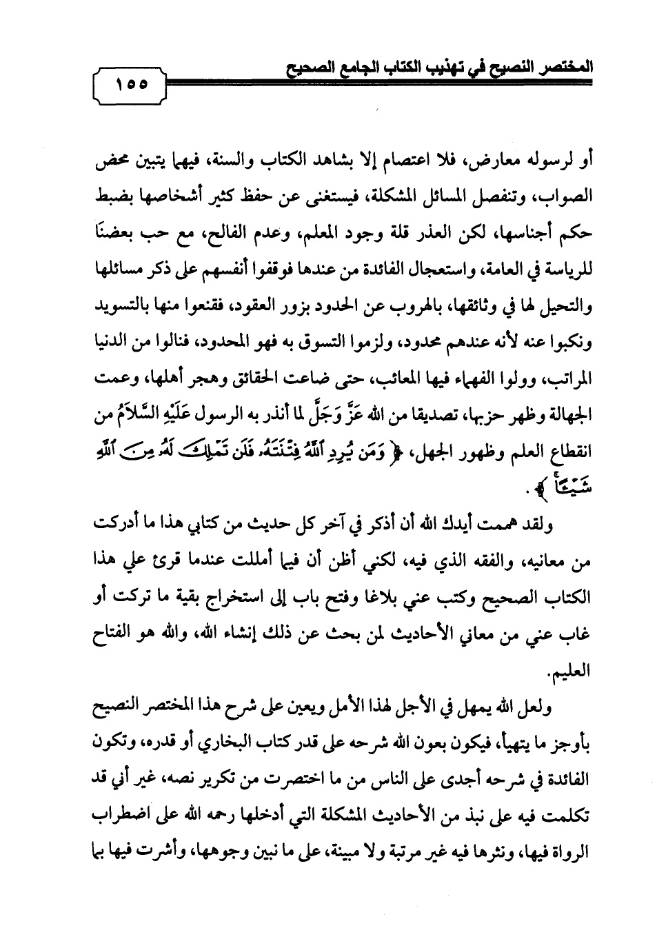 ولعل الله يمهل في الأجل لهذا الأمل ويعين على شرح هذا المختصر النصيح بأوجز ما يتهيأ, فيكون بعون الله شرحه على قدر كتاب البخاري أو قدره، وتكون الفائدة في شرحه أجدى على الناس من ما اختصرت من تكرير نصه، غير أني قد تكلمت فيه على نبذ من الأحاديث المشكلة التي أدخلها رحمه الله على اضطراب الرواة فيها، ونثرها فيه غير مرتبة ولا مبينة، على ما نبين وجوهها، وأشرت فيها بما