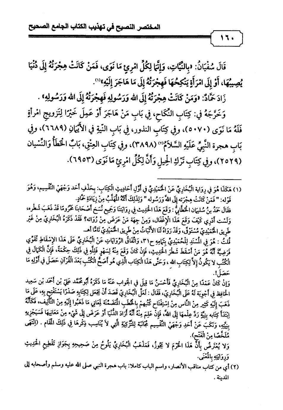 (¬1) هَكَذَا هُوَ في رِوَاية الْبُخَارِيِّ عَنْ الْحُمَيْدِيِّ في أَوَّلِ أَحَادِيثِ الْكِتَابِ: بِحَذْفِ أَحَد وَجْهَيْ التَّقْسِيم، وَهُوَ قَوْله: " فَمَنْ كَانَتْ هِجْرَته إِلَى اللَّه وَرَسُوله " وَلِذَلِكَ أَتَمَّهُ الْمُهَلَّبُ مِنْ زِيَادَةِ حَمَّادٍ.