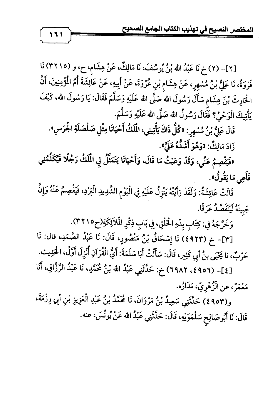 [2]- (2) خ نَا عَبْدُ الله بْنُ يُوسُفَ، نَا مَالِكٌ، عَنْ هِشَامِ، ح, و (3215) نَا فَرْوَةُ، نَا عَلِيُّ بْنُ مُسْهِرٍ، عَنْ هِشَامِ بْنِ عُرْوَةَ، عَنْ أَبِيهِ، عَنْ عَائِشَةَ أُمِّ الْمُؤْمِنِينَ، أَنَّ الْحَارِثَ بْنَ هِشَامٍ سَأَلَ رَسُولَ الله صَلَّى الله عَلَيْهِ وَسَلَّمَ فَقَالَ: يَا رَسُولَ الله، كَيْفَ يَأْتِيكَ الْوَحْيُ؟ فَقَالَ رَسُولُ الله صَلَّى الله عَلَيْهِ وَسَلَّمَ.