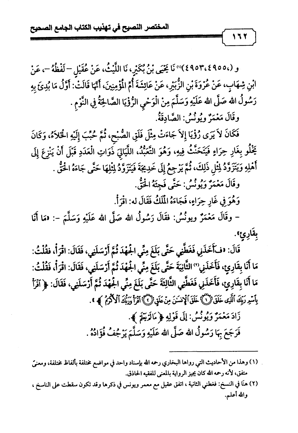 - وقَالَ مَعْمَرٌ ويونُسُ: فقَالَ رَسُولُ الله صَلَّى الله عَلَيْهِ وَسَلَّمَ -: «مَا أَنَا بِقَارِئٍ».