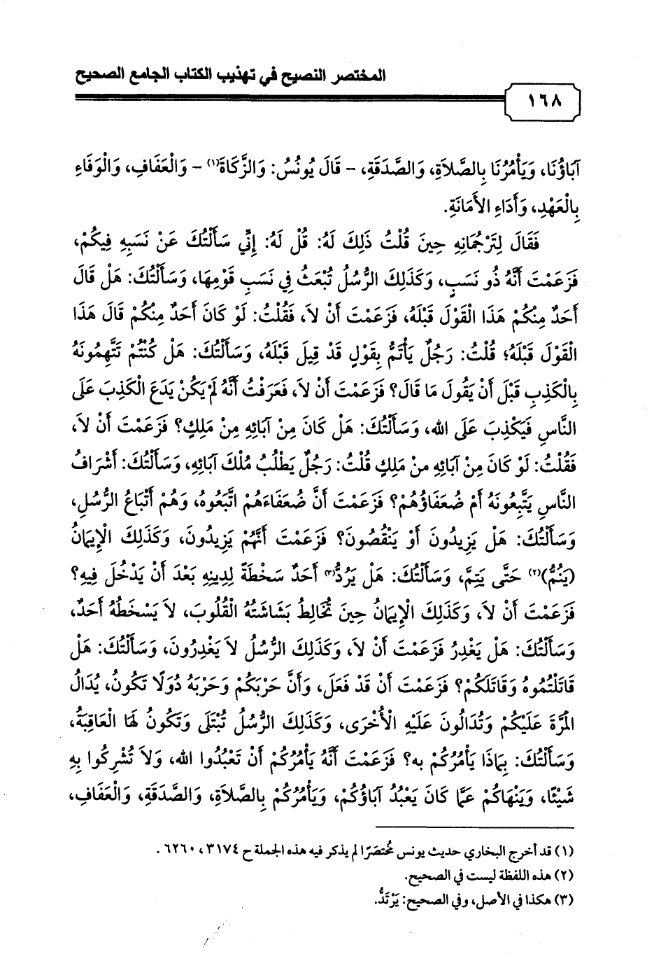 فَقَالَ لِتَرْجُمَانِهِ حِينَ قُلْتُ ذَلِكَ لَهُ: قُلْ لَهُ: إِنِّي سَأَلْتُكَ عَنْ نَسَبِهِ فِيكُمْ، فَزَعَمْتَ أَنَّهُ ذُو نَسَبٍ، وَكَذَلِكَ الرُّسُلُ تُبْعَثُ فِي نَسَبِ قَوْمِهَا، وَسَأَلْتُكَ: هَلْ قَالَ أَحَدٌ مِنْكُمْ هَذَا الْقَوْلَ قَبْلَهُ، فَزَعَمْتَ أَنْ لاَ، فَقُلْتُ: لَوْ كَانَ أَحَدٌ مِنْكُمْ قَالَ هَذَا الْقَوْلَ قَبْلَهُ؛ قُلْتُ: رَجُلٌ يَأْتَمُّ بِقَوْلٍ قَدْ قِيلَ قَبْلَهُ، وَسَأَلْتُكَ: هَلْ كُنْتُمْ تَتَّهِمُونَهُ بِالْكَذِبِ قَبْلَ أَنْ يَقُولَ مَا قَالَ؟ فَزَعَمْتَ أَنْ لاَ، فَعَرَفْتُ أَنَّهُ لَمْ يَكُنْ يَدَعَ الْكَذِبَ عَلَى النَّاسِ فَيَكْذِبَ عَلَى الله، وَسَأَلْتُكَ: هَلْ كَانَ مِنْ آبَائِهِ مِنْ مَلِكٍ؟ فَزَعَمْتَ أَنْ لاَ، فَقُلْتُ: لَوْ كَانَ مِنْ آبَائِهِ منْ مَلِكٍ قُلْتُ: رَجُلٌ يَطْلُبُ مُلْكَ آبَائِهِ، وَسَأَلْتُكَ: أَشْرَافُ النَّاسِ يَتَّبِعُونَهُ أَمْ ضُعَفَاؤُهُمْ؟ فَزَعَمْتَ أَنَّ ضُعَفَاءَهُمْ اتَّبَعُوهُ، وَهُمْ أَتْبَاعُ الرُّسُلِ، وَسَأَلْتُكَ: هَلْ يَزِيدُونَ أَوْ يَنْقُصُونَ؟ فَزَعَمْتَ أَنَّهُمْ يَزِيدُونَ، وَكَذَلِكَ الْإِيمَانُ (يَنُمُّ) (¬2) حَتَّى يَتِمَّ، وَسَأَلْتُكَ: هَلْ يَرُدُّ (¬3) أَحَدٌ سَخْطَةً لِدِينِهِ بَعْدَ أَنْ يَدْخُلَ فِيهِ؟ فَزَعَمْتَ أَنْ لاَ، وَكَذَلِكَ الْإِيمَانُ حِينَ تُخَالِطُ بَشَاشَتُهُ الْقُلُوبَ، لاَ يَسْخَطُهُ أَحَدٌ، وَسَأَلْتُكَ: هَلْ يَغْدِرُ فَزَعَمْتَ أَنْ لاَ، وَكَذَلِكَ الرُّسُلُ لاَ يَغْدِرُونَ، وَسَأَلْتُكَ: هَلْ قَاتَلْتُمُوهُ وَقَاتَلَكُمْ؟ فَزَعَمْتَ أَنْ قَدْ فَعَلَ، وَأَنَّ حَرْبَكُمْ وَحَرْبَهُ دُوَلًا تَكُونُ، يُدَالُ الْمَرَّةَ عَلَيْكُمْ وَتُدَالُونَ عَلَيْهِ الْأُخْرَى، وَكَذَلِكَ الرُّسُلُ تُبْتَلَى وَتَكُونُ لَهَا الْعَاقِبَةُ، وَسَأَلْتُكَ: بِمَاذَا يَأْمُرُكُمْ به؟ فَزَعَمْتَ أَنَّهُ يَأْمُرُكُمْ أَنْ تَعْبُدُوا الله، وَلاَ تُشْرِكُوا بِهِ شَيْئًا، وَيَنْهَاكُمْ عَمَّا كَانَ يَعْبُدُ آبَاؤُكُمْ، وَيَأْمُرُكُمْ بِالصَّلاَةِ، وَالصَّدَقَةِ، وَالْعَفَافِ،