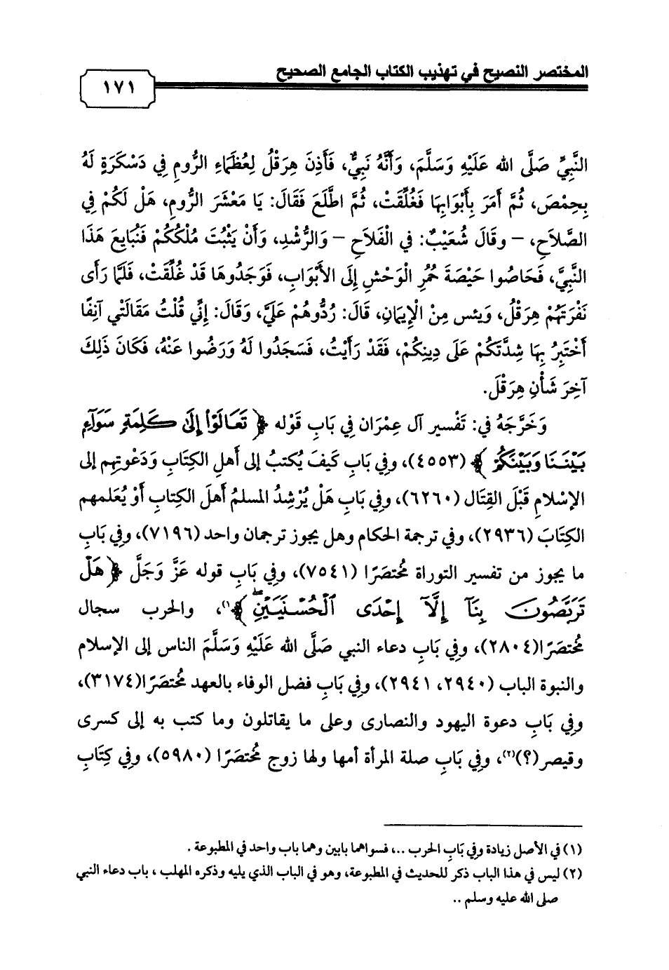 وَخَرَّجَهُ في: تَفْسير آل عِمْرَان فِي بَابِ قَوْله {تَعَالَوْا إِلَى كَلِمَةٍ سَوَاءٍ بَيْنَنَا وَبَيْنَكُمْ} (4553)، وفِي بَابِ كَيفَ يُكتبُ إلى أَهلِ الكِتَابِ وَدَعْوتِهِم إلى الإسْلامِ قَبْلَ القِتَال (6260)، وفِي بَابِ هَلْ يُرْشِدُ المسلمُ أَهلَ الكِتابِ أَوْ يُعَلمهم الكِتَابَ (2936)، وفي ترجمة الحكام وهل يجوز ترجمان واحد (7196)، وفِي بَابِ ما يجوز من تفسير التوراة مُختصَرًا (7541) , وفِي بَابِ قوله عَزَّ وَجَلَّ {هَلْ تَرَبَّصُونَ بِنَا إِلَّا إِحْدَى الْحُسْنَيَيْنِ} (¬1)، والحرب سجال مُختصَرًا (2804)، وفِي بَابِ دعاء النبي صَلَّى الله عَلَيْهِ وَسَلَّمَ الناس إلى الإسلام والنبوة الباب (2940، 2941)، وفِي بَابِ فضل الوفاء بالعهد مُختصَرًا (3174)، وفِي بَابِ دعوة اليهود والنصارى وعلى ما يقاتلون وما كتب به إلى كسرى وقيصر (؟) (¬2)، وفِي بَابِ صلة المرأة أمها ولها زوج مُختصَرًا (5980)، وفِي كِتَابِ