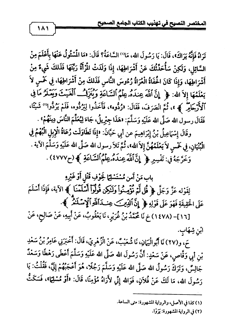 تَرَاهُ فَإِنَّهُ يَرَاكَ» , قَالَ: يَا رَسُولَ الله، مَا (¬1) السَّاعَةُ؟ قَالَ: «مَا الْمَسْئُولُ عَنْهَا بِأَعْلَمَ مِنْ السَّائِلِ، وَلَكِنْ سَأُحَدِّثُكَ عَنْ أَشْرَاطِهَا، إِذَا وَلَدَتْ الْمَرْأَةُ رَبَّتَهَا فَذَلكَ شَيءٌ مِنْ أَشْرَاطِهَا، وَإِذَا كَانَ الْحُفَاةُ الْعُرَاةُ رُءُوسَ النَّاسِ فَذَلكَ مِنْ أَشْرَاطِهَا، فِي خَمْسٍ لاَ يَعْلَمُهَا إِلاَ الله: {إِنَّ اللَّهَ عِنْدَهُ عِلْمُ السَّاعَةِ وَيُنَزِّلُ الْغَيْثَ وَيَعْلَمُ مَا فِي الْأَرْحَامِ}» , ثُمَّ انْصَرَفَ، فَقَالَ: «رُدُّوه»، فَأَخَذُوا لِيَرُدُّوه، فَلَمْ يَرُدُّوا (¬2) شَيْئًا، فَقَالَ رسول الله صَلَّى الله عَلَيْهِ وَسَلَّمَ: «هَذَا جِبْرِيلُ، جَاءَ لِيُعَلِّمَ النَّاسَ دِينَهُمْ».
