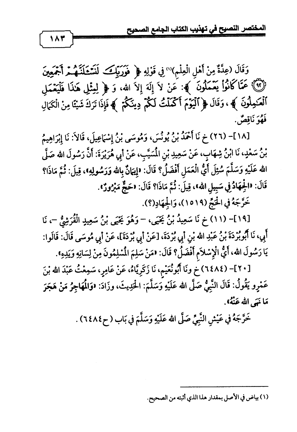 [18]- (26) خ نَا أَحْمَدُ بْنُ يُونُسَ، وَمُوسَى بْنُ إِسْمَاعِيلَ، قَالاَ: نَا إِبْرَاهِيمُ بْنُ سَعْدٍ، نَا ابْنُ شِهَابٍ، عَنْ سَعِيدِ بْنِ الْمُسَيَّبِ، عَنْ أبِي هُرَيْرَةَ: أَنَّ رَسُولَ الله صَلَّى الله عَلَيْهِ وَسَلَّمَ سُئِلَ أَيُّ الْعَمَلِ أَفْضَلُ؟ قَالَ: «إِيمَانٌ بِالله وَرَسُولِهِ» , قِيلَ: ثُمَّ مَاذَا؟ قَالَ: «الْجِهَادُ فِي سَبِيلِ الله»، قِيلَ: ثُمَّ مَاذَا؟ قَالَ: «حَجٌّ مَبْرُورٌ».