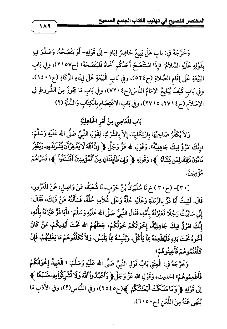 [30]- (ح30) خ نَا سُلَيْمَانُ بْنُ حَرْبٍ, نَا شُعْبَةُ, عَنْ وَاصِلٍ, عَنْ الْمَعْرُورِ, قَالَ: لَقِيتُ أَبَا ذَرٍّ بِالرَّبَذَةِ وَعَلَيْهِ حُلَّةٌ وَعَلَى غُلاَمِهِ حُلَّةٌ، فَسَأَلْتُهُ عَنْ ذَلِكَ، فَقَالَ: إِنِّي سَابَّيْتُ رَجُلًا فَعَيَّرْتُهُ بِأُمِّهِ، فَقَالَ النَّبِيُّ صَلَّى الله عَلَيْهِ وَسَلَّمَ: «أَبَا ذَرٍّ عَيَّرْتَهُ بِأُمِّهِ, إِنَّكَ امْرُؤٌ فِيكَ جَاهِلِيَّةٌ، إِخْوَانُكُمْ خَوَلُكُمْ, جَعَلَهُمْ الله تَحْتَ أَيْدِيكُمْ, مَنْ كَانَ أَخُوهُ تَحْتَ يَدِهِ فَلْيُطْعِمْهُ مِمَّا يَأْكُلُ، وَيُلْبِسْهُ مِمَّا يَلْبَسُ, وَلاَ تُكَلِّفُوهُمْ مَا يَغْلِبُهُمْ, فَإِنْ كَلَّفْتُمُوهُمْ فَأَعِينُوهُمْ».