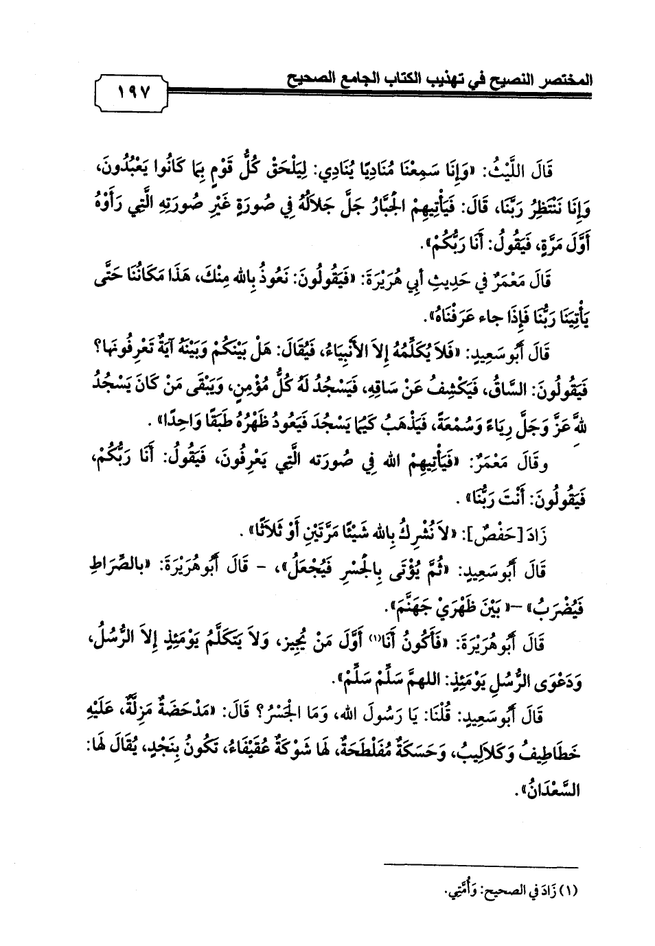قَالَ أَبُوسَعِيدٍ: «ثُمَّ يُؤْتَى بِالْجَسْرِ فَيُجْعَلُ»، - قَالَ أَبُوهُرَيْرَةَ: «بالصِّرَاطِ فَيُضْرَبُ» - «بَيْنَ ظَهْرَيْ جَهَنَّمَ».