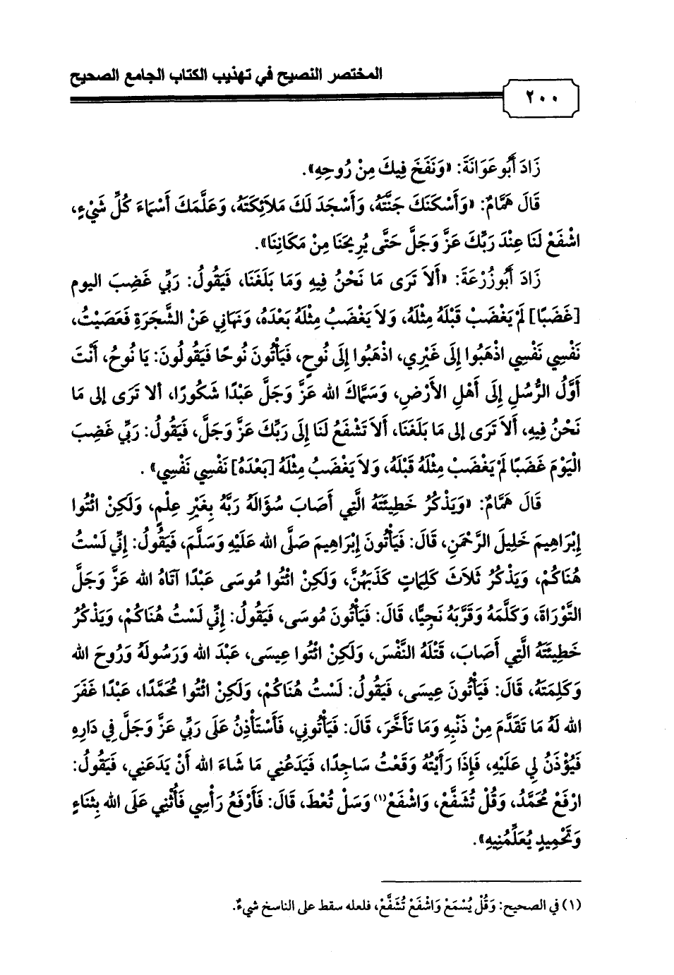قَالَ هَمَّامٌ: «وَيَذْكُرُ خَطِيئَتَهُ الَّتِي أَصَابَ سُؤَالَهُ رَبَّهُ بِغَيْرِ عِلْمٍ، وَلَكِنْ ائْتُوا إِبْرَاهِيمَ خَلِيلَ الرَّحْمَنِ، قَالَ: فَيَأْتُونَ إِبْرَاهِيمَ صَلَّى الله عَلَيْهِ وَسَلَّمَ، فَيَقُولُ: إِنِّي لَسْتُ هُنَاكُمْ، وَيَذْكُرُ ثَلاَثَ كَلِمَاتٍ كَذَبَهُنَّ، وَلَكِنْ ائْتُوا مُوسَى عَبْدًا آتَاهُ الله عَزَّ وَجَلَّ التَّوْرَاةَ، وَكَلَّمَهُ وَقَرَّبَهُ نَجِيًّا، قَالَ: فَيَأْتُونَ مُوسَى، فَيَقُولُ: إِنِّي لَسْتُ هُنَاكُمْ، وَيَذْكُرُ خَطِيئَتَهُ الَّتِي أَصَابَ، قَتْلَهُ النَّفْسَ، وَلَكِنْ ائْتُوا عِيسَى، عَبْدَ الله وَرَسُولَهُ وَرُوحَ الله وَكَلِمَتَهُ، قَالَ: فَيَأْتُونَ عِيسَى, فَيَقُولُ: لَسْتُ هُنَاكُمْ, وَلَكِنْ ائْتُوا مُحَمَّدًا، عَبْدًا غَفَرَ الله لَهُ مَا تَقَدَّمَ مِنْ ذَنْبِهِ وَمَا تَأَخَّرَ، قَالَ: فَيَأْتُونِي، فَأَسْتَأْذِنُ عَلَى رَبِّي عَزَّ وَجَلَّ فِي دَارِهِ فَيُؤْذَنُ لِي عَلَيْهِ، فَإِذَا رَأَيْتُهُ وَقَعْتُ سَاجِدًا، فَيَدَعُنِي مَا شَاءَ الله أَنْ يَدَعَنِي، فَيَقُولُ: ارْفَعْ مُحَمَّدُ، وَقُلْ تُشَفَّعْ، وَاشْفَعْ (¬1) وَسَلْ تُعْطَ، قَالَ: فَأَرْفَعُ رَأْسِي فَأُثْنِي عَلَى الله بِثَنَاءٍ وَتَحْمِيدٍ يُعَلِّمُنِيهِ».