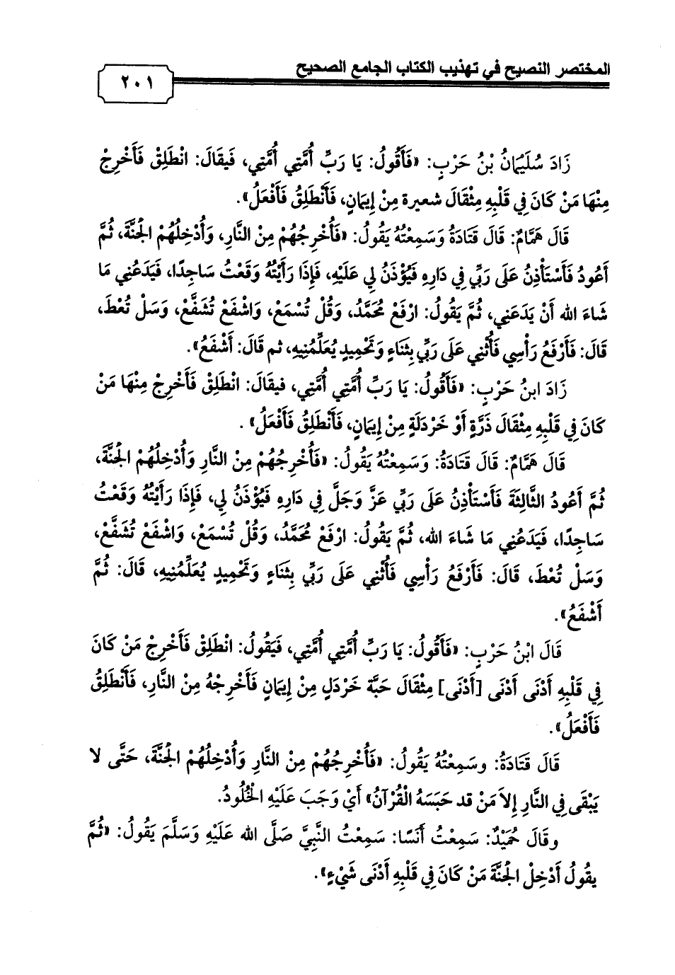 قَالَ ابْنُ حَرْبٍ: «فَأَقُولُ: يَا رَبِّ أُمَّتِي أُمَّتِي, فَيَقُولُ: انْطَلِقْ فَأَخْرِجْ مَنْ كَانَ فِي قَلْبِهِ أَدْنَى أَدْنَى [أَدْنَى] مِثْقَالَ حَبَّة خَرْدَلٍ مِنْ إِيمَانٍ فَأَخْرِجْهُ مِنْ النَّارِ, فَأَنْطَلِقُ فَأَفْعَلُ».