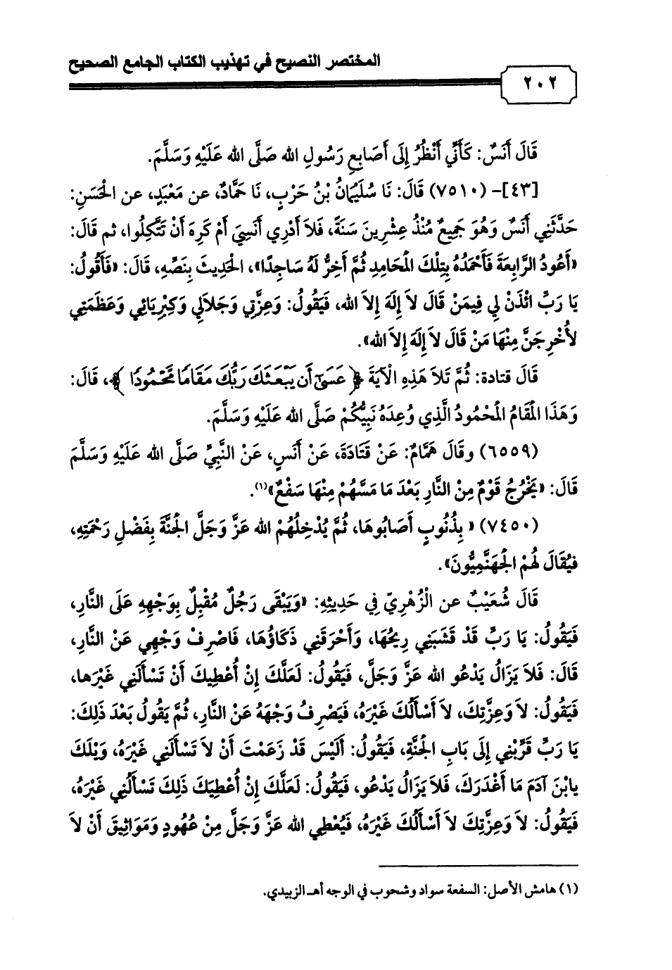 [43]- (7510) قَالَ: نَا سُلَيْمَانُ بْنُ حَرْبٍ، نَا حَمَّادٌ، عن مَعْبَدٍ، عن الْحَسَنِ: حَدَّثَنِي أَنَسٌ وَهُوَ جَمِيعٌ مُنْذُ عِشْرِينَ سَنَةً، فَلاَ أَدْرِي أَنَسِيَ أَمْ كَرِهَ أَنْ تَتَّكِلُوا، ثم قَالَ: «أَعُودُ الرَّابِعَةَ فَأَحْمَدُهُ بِتِلْكَ الْمَحَامِدِ ثُمَّ أَخِرُّ لَهُ سَاجِدًا» , الْحَدِيثَ بِنَصِّهِ، قَالَ: «فَأَقُولُ: يَا رَبِّ ائْذَنْ لِي فِيمَنْ قَالَ لاَ إِلَهَ إِلاَ الله, فَيَقُولُ: وَعِزَّتِي وَجَلاَلِي وَكِبْرِيَائِي وَعَظَمَتِي لأُخْرِجَنَّ مِنْهَا مَنْ قَالَ لاَ إِلَهَ إِلاَ الله».