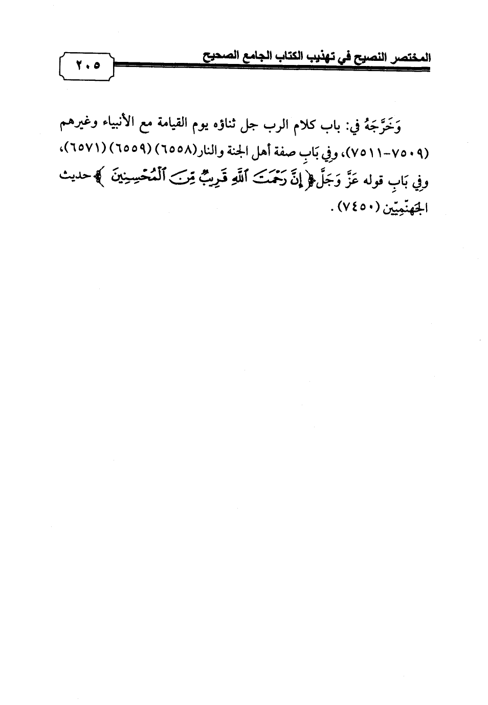 وَخَرَّجَهُ في: باب كلام الرب جل ثناؤه يوم القيامة مع الأنبياء وغيرهم (7509 - 7511)، وفِي بَابِ صفة أهل الجنة والنار (6558) (6559) (6571)، وفِي بَابِ قوله عَزَّ وَجَلَّ {إِنَّ رَحْمَتَ اللَّهِ قَرِيبٌ مِنَ الْمُحْسِنِينَ} حديث الجَهنّمِيّين (7450).