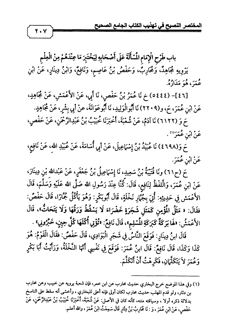 (¬1) وفي هذا الموضع خرج البخاري حديث محارب عن ابن عمر، فإن شعبة يرويه عن خبيب وعن محارب بن دثار، ولو قدم المهلب حديث محارب لكان أولى فإنه أعلى للبخاري، وأخشى أنه سقط على الناسخ بدلالة ذكره أولا، وسياقته متنه، كأنه كان في الأصل: عَنْ شُعْبَةَ، أَخْبَرَنَا خُبَيْبُ بْنُ عَبْدِالرَّحْمَنِ، عَنْ حَفْصٍ، عَنْ ابْنِ عُمَرَ، وَ: نَا مُحَارِبُ بْنُ دِثَارٍ قَالَ سَمِعْتُ ابْنَ عُمَرَ، والله أعلم.