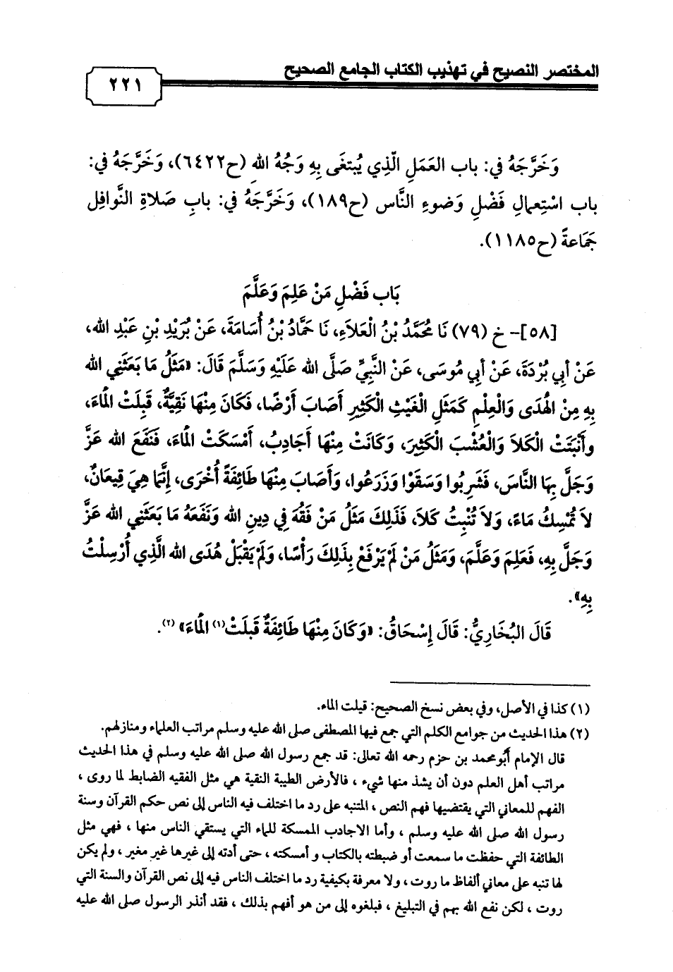 [58]- خ (79) نَا مُحَمَّدُ بْنُ الْعَلاَءِ، نَا حَمَّادُ بْنُ أُسَامَةَ، عَنْ بُرَيْدِ بْنِ عَبْدِ الله، عَنْ أبِي بُرْدَةَ، عَنْ أبِي مُوسَى، عَنْ النَّبِيِّ صَلَّى الله عَلَيْهِ وَسَلَّمَ قَالَ: «مَثَلُ مَا بَعَثَنِي الله بِهِ مِنْ الْهُدَى وَالْعِلْمِ كَمَثَلِ الْغَيْثِ الْكَثِيرِ أَصَابَ أَرْضًا، فَكَانَ مِنْهَا نَقِيَّةٌ، قَبِلَتْ الْمَاءَ، وأَنْبَتَتْ الْكَلاَ وَالْعُشْبَ الْكَثِيرَ، وَكَانَتْ مِنْهَا أَجَادِبُ، أَمْسَكَتْ الْمَاءَ، فَنَفَعَ الله عَزَّ وَجَلَّ بِهَا النَّاسَ، فَشَرِبُوا وَسَقَوْا وَزَرَعُوا، وَأَصَابَ مِنْهَا طَائِفَةً أُخْرَى، إِنَّمَا هِيَ قِيعَانٌ، لاَ تُمْسِكُ مَاءً، وَلاَ تُنْبِتُ كَلاَ، فَذَلِكَ مَثَلُ مَنْ فَقُهَ فِي دِينِ الله وَنَفَعَهُ مَا بَعَثَنِي الله عَزَّ وَجَلَّ بِهِ، فَعَلِمَ وَعَلَّمَ، وَمَثَلُ مَنْ لَمْ يَرْفَعْ بِذَلِكَ رَأْسًا، وَلَمْ يَقْبَلْ هُدَى الله الَّذِي أُرْسِلْتُ بِهِ».