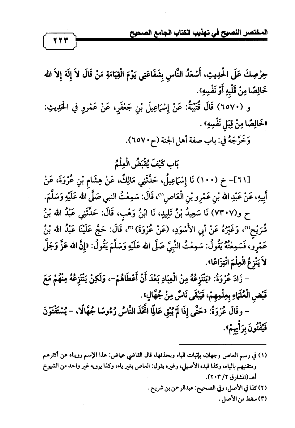 - زَادَ عُرْوَةُ: «يَنْتَزِعُهُ مِنْ الْعِبَادِ بَعْدَ أَنْ أَعْطَاهُمْ-, وَلَكِنْ يَنْتَزِعُهُ مِنْهُمْ مَعَ قَبْضِ الْعُلَمَاءِ بِعِلْمِهِمْ، فَيَبْقَى نَاسٌ مِنْ جُهَّالٍ».