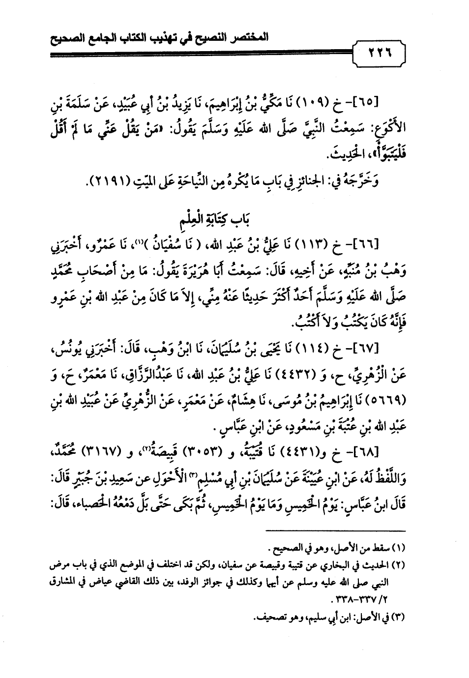 [68]- خ و (4431) نَا قُتَيْبَةُ، و (3053) قَبِيصَةُ (¬2)، و (3167) مُحَمَّدٌ، وَاللَّفْظُ لَهُ، عَنْ ابْنِ عُيَيْنَةَ عَنْ سُلَيْمَانَ بْنِ أبِي مُسْلِمٍ (¬3) الْأَحْوَلِ عن سَعِيدِ بْنَ جُبَيْرٍ قَالَ: قَالَ ابنُ عَبَّاسٍ: يَوْمُ الْخَمِيسِ وَمَا يَوْمُ الْخَمِيسِ، ثُمَّ بَكَى حَتَّى بَلَّ دَمْعُهُ الْحَصباء، قَالَ: