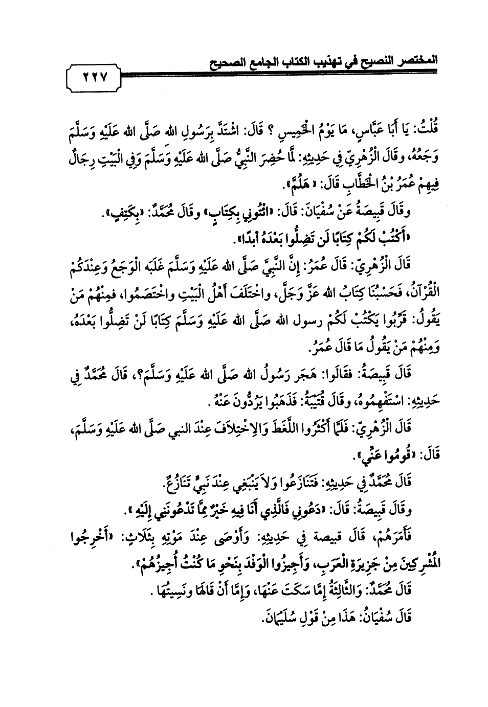 قُلْتُ: يَا أَبَا عَبَّاسٍ، مَا يَوْمُ الْخَمِيسِ؟ قَالَ: اشْتَدَّ بِرَسُولِ اللهِ صَلَّى الله عَلَيْهِ وَسَلَّمَ وَجَعُهُ، وقَالَ الْزُهْرِيّ فِي حَدِيثِهِ: لَمَّا حُضِرَ النَّبِيُّ صَلَّى الله عَلَيْهِ وَسَلَّمَ وَفِي الْبَيْتِ رِجَالٌ فِيهِمْ عُمَرُ بْنُ الْخَطَّابِ قَالَ: «هَلُمَّ».