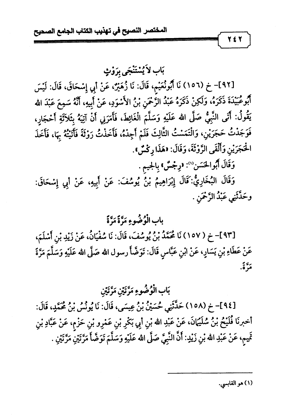 [92]- خ (156) نَا أَبُونُعَيْمٍ، قَالَ: نَا زُهَيْرٌ، عَنْ أبِي إِسْحَاقَ، قَالَ: لَيْسَ أَبُوعُبَيْدَةَ ذَكَرَهُ، وَلَكِنْ ذَكَرَهُ عَبْدُ الرَّحْمَنِ بْنُ الأَسْوَدِ، عَنْ أَبِيهِ، أَنَّهُ سَمِعَ عَبْدَ الله يَقُولُ: أَتَى النَّبِيُّ صَلَّى الله عَلَيْهِ وَسَلَّمَ الْغَائِطَ، فَأَمَرَنِي أَنْ آتِيَهُ بِثَلاَثَةِ أَحْجَارٍ، فَوَجَدْتُ حَجَرَيْنِ، وَالْتَمَسْتُ الثَّالِثَ فَلَمْ أَجِدْهُ، فَأَخَذْتُ رَوْثَةً فَأَتَيْتُهُ بِهَا، فَأَخَذَ الْحَجَرَيْنِ وَأَلْقَى الرَّوْثَةَ، وَقَالَ: «هَذَا رِكْسٌ».