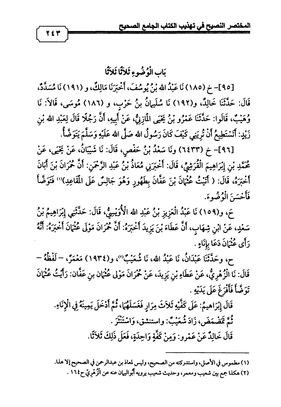 [95]- خ (185) نَا عَبْدُ الله بْنُ يُوسُفَ، أَخْبَرَنَا مَالِكٌ, و (191) نَا مُسَدَّدٌ، قَالَ: حَدَّثَنَا خَالِدٌ، و (192) نَا سُلَيمانُ بنُ حَرْبٍ، و (186) مُوسَى، قَالاَ: نَا وُهَيْبٌ, قَالَوا: حَدَّثَنَا عَمْرُو بْنُ يَحْيَى الْمَازِنِيُّ، عَنْ أَبِيهِ، أَنَّ رَجُلًا قَالَ لِعَبْدِ الله بْنِ زَيْدٍ: أَتَسْتَطِيعُ أَنْ تُرِيَنِي كَيْفَ كَانَ رَسُولُ الله صَلَّى الله عَلَيْهِ وَسَلَّمَ يَتَوَضَّأُ.