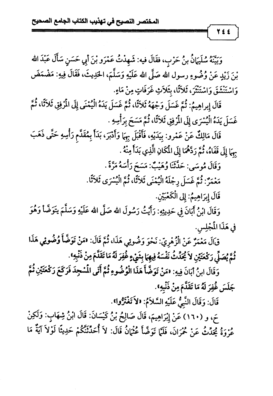 حَ، و (160) عَنْ إِبْرَاهِيمَ، قَالَ صَالِحُ بْنُ كَيْسَانَ: قَالَ ابْنُ شِهَابٍ: وَلَكِنْ عُرْوَةُ يُحَدِّثُ عَنْ حُمْرَانَ، فَلَمَّا تَوَضَّأَ عُثْمَانُ قَالَ: لاَ أُحَدِّثَنَّكُمْ حَدِيثًا لَوْلاَ آيَةٌ مَا