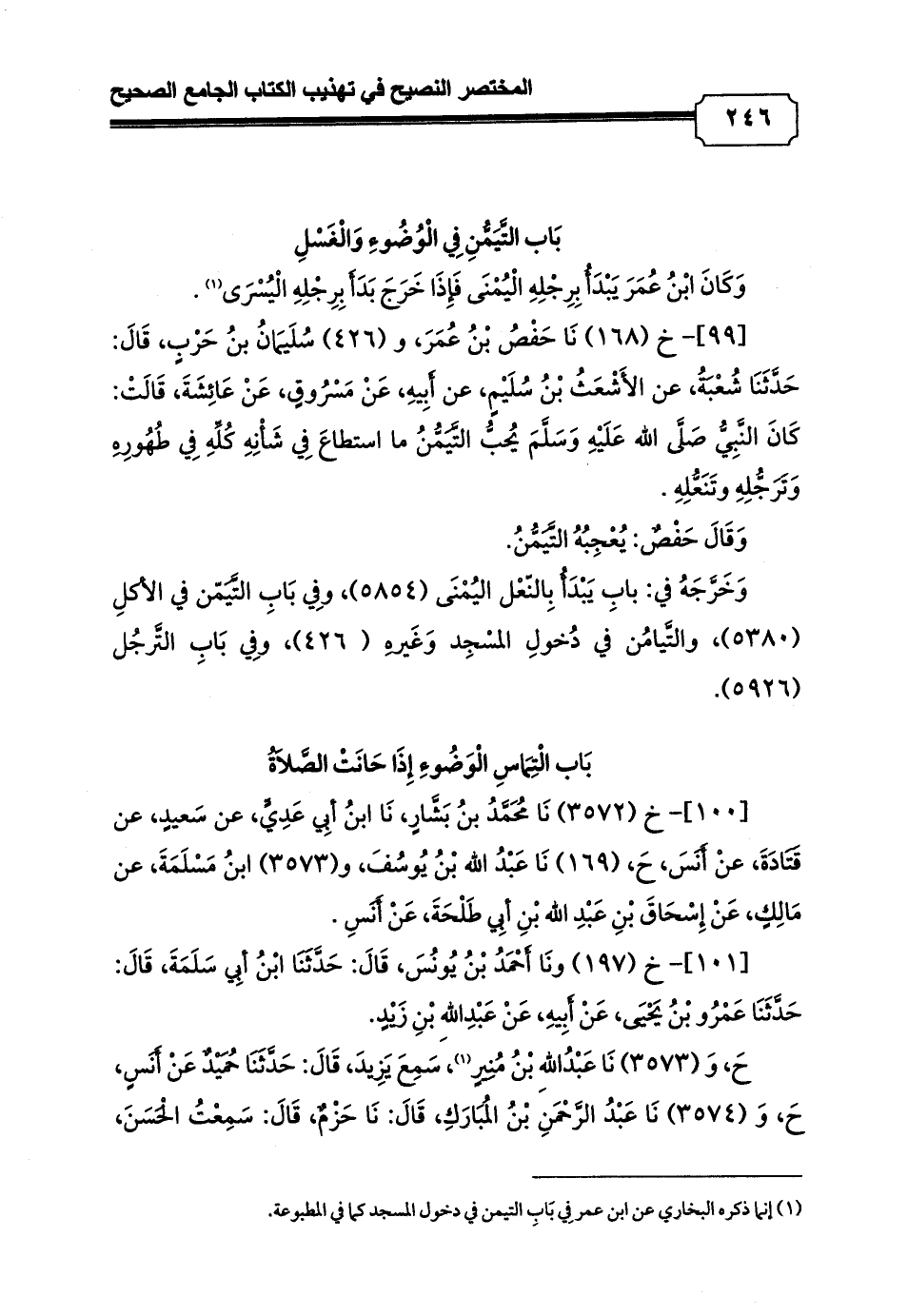 [99]- خ (168) نَا حَفْصُ بْنُ عُمَرَ، و (426) سُلَيمَانُ بنُ حَرْبٍ، قَالَ: حَدَّثَنَا شُعْبَةُ، عن الأَشْعَثُ بْنُ سُلَيْمٍ، عن أَبِيهِ، عَنْ مَسْرُوقٍ، عَنْ عَائِشَةَ، قَالَتْ: كَانَ النَّبِيُّ صَلَّى الله عَلَيْهِ وَسَلَّمَ يُحبُّ التَّيَمُّنُ ما استطاعَ فِي شَأْنِهِ كُلِّهِ فِي طُهُورِهِ وَتَرَجُّلِهِ وتَنَعُّلِهِ.
