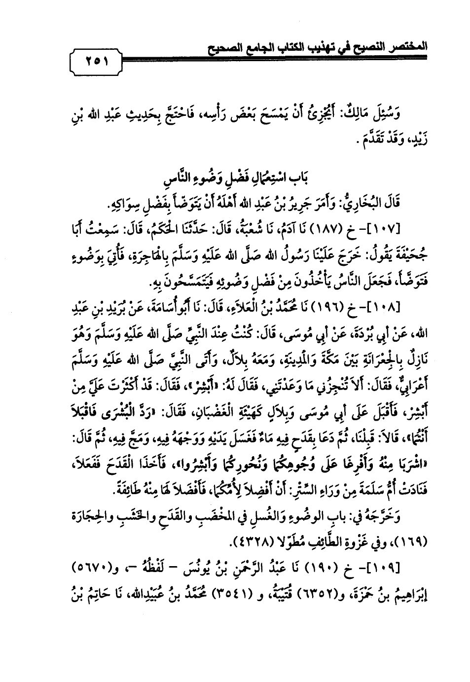 [108]- خ (196) نَا مُحَمَّدُ بْنُ الْعَلاَءِ، قَالَ: نَا أَبُوأُسَامَةَ، عَنْ بُرَيْدِ بْنِ عَبْدِ الله، عَنْ أبِي بُرْدَةَ، عَنْ أبِي مُوسَى، قَالَ: كُنْتُ عِنْدَ النَّبِيِّ صَلَّى الله عَلَيْهِ وَسَلَّمَ وَهُوَ نَازِلٌ بِالْجِعْرَانَةِ بَيْنَ مَكَّةَ وَالْمَدِينَةِ، وَمَعَهُ بِلاَلٌ، وَأَتَى النَّبِيَّ صَلَّى الله عَلَيْهِ وَسَلَّمَ أَعْرَابِيٌّ، فَقَالَ: أَلاَ تُنْجِزُني مَا وَعَدْتَنِي، فَقَالَ لَهُ: «أَبْشِرْ»، فَقَالَ: قَدْ أَكْثَرْتَ عَلَيَّ مِنْ أَبْشِرْ، فَأَقْبَلَ عَلَى أبِي مُوسَى وَبِلاَلٍ كَهَيْئَةِ الْغَضْبَانِ، فَقَالَ: «رَدَّ الْبُشْرَى فَاقْبَلاَ أَنْتُمَا»، قَالاَ: قَبِلْنَا، ثُمَّ دَعَا بِقَدَحٍ فِيهِ مَاءٌ فَغَسَلَ يَدَيْهِ وَوَجْهَهُ فِيهِ، وَمَجَّ فِيهِ، ثُمَّ قَالَ: «اشْرَبَا مِنْهُ وَأَفْرِغَا عَلَى وُجُوهِكُمَا وَنُحُورِكُمَا وَأَبْشِرُوا»، فَأَخَذَا الْقَدَحَ فَفَعَلاَ، فَنَادَتْ أُمُّ سَلَمَةَ مِنْ وَرَاءِ السِّتْرِ: أَنْ أَفْضِلاَ لِأُمِّكُمَا، فَأَفْضَلاَ لَهَا مِنْهُ طَائِفَةً.