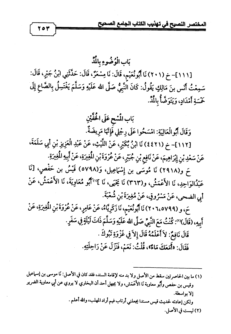 [111]- خ (201) نَا أَبُونُعَيْمٍ، قَالَ: نَا مِسْعَرٌ، قَالَ: حَدَّثَنِي ابْنُ جَبْرٍ، قَالَ: سَمِعْتُ أَنَس بنَ مَالِكٍ يَقُولُ: كَانَ النَّبِيُّ صَلَّى الله عَلَيْهِ وَسَلَّمَ يَغْتَسِلُ بِالصَّاعِ إِلَى خَمْسَةِ أَمْدَادٍ، وَيَتَوَضَّأُ بِالْمُدِّ.