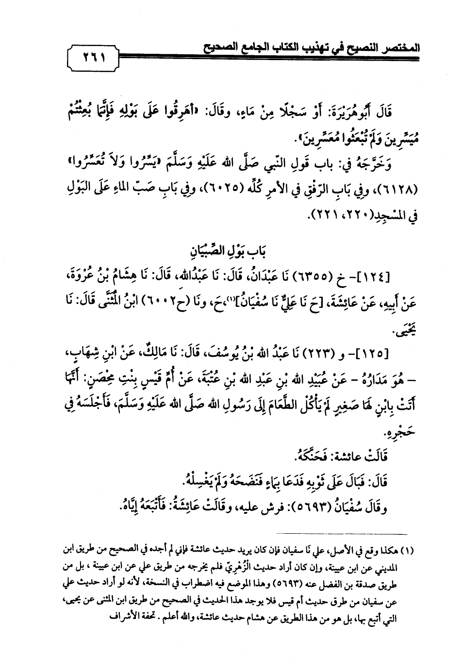 [125]- و (223) نَا عَبْدُ الله بْنُ يُوسُفَ، قَالَ: نَا مَالِكٌ، عَنْ ابْنِ شِهَابٍ، - هُوَ مَدَارُهُ - عَنْ عُبَيْدِ الله بْنِ عَبْدِ الله بْنِ عُتْبَةَ، عَنْ أُمِّ قَيْسٍ بِنْتِ مِحْصَنٍ: أَنَّهَا أَتَتْ بِابْنٍ لَهَا صَغِيرٍ لَمْ يَأْكُلْ الطَّعَامَ إِلَى رَسُولِ الله صَلَّى الله عَلَيْهِ وَسَلَّمَ، فَأَجْلَسَهُ فِي حَجْرِهِ.