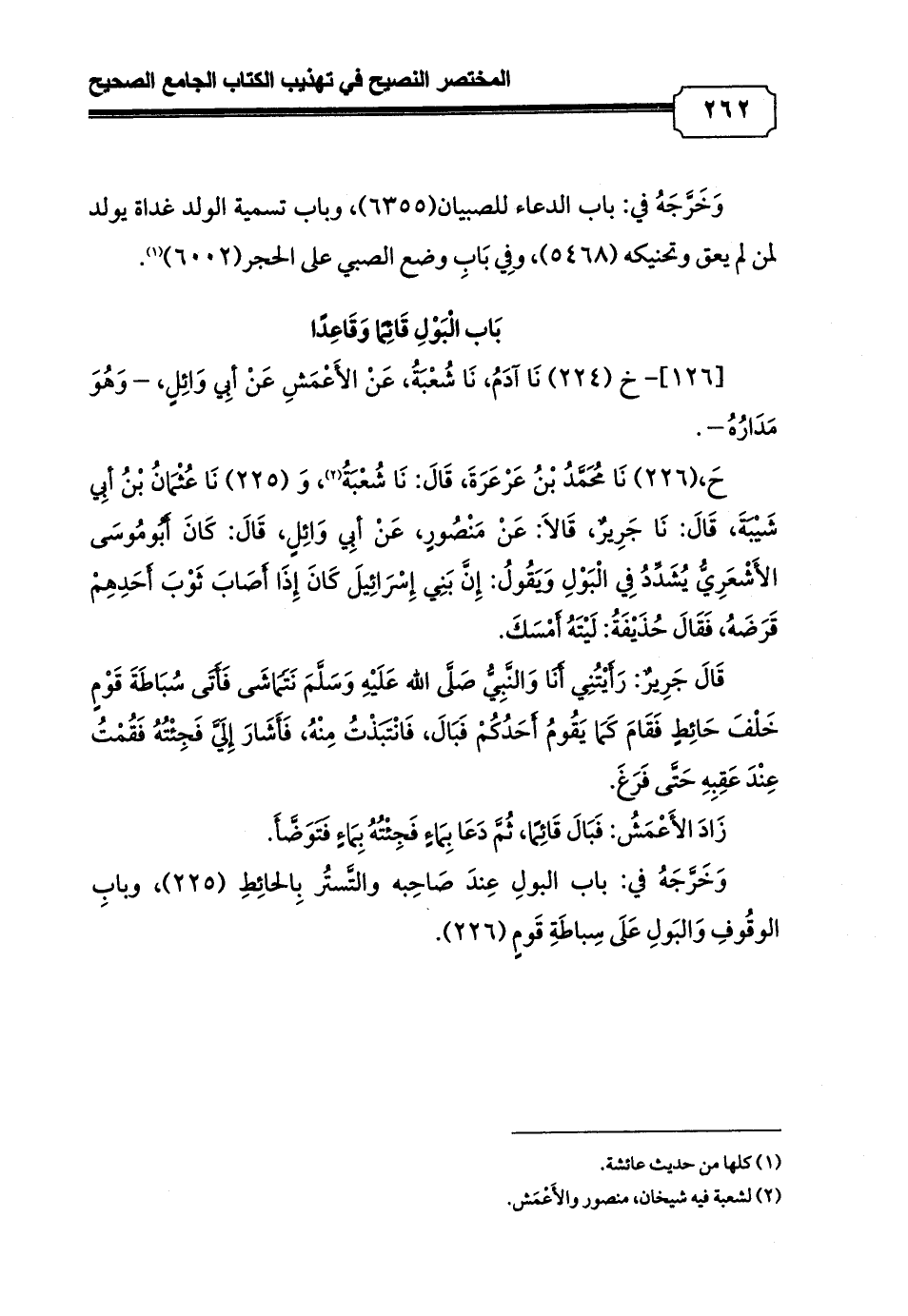 حَ, (226) نَا مُحَمَّدُ بْنُ عَرْعَرَةَ، قَالَ: نَا شُعْبَةُ (¬2) , وَ (225) نَا عُثْمَانُ بْنُ أبِي شَيْبَةَ، قَالَ: نَا جَرِيرٌ، قَالاَ: عَنْ مَنْصُورٍ، عَنْ أبِي وَائِلٍ، قَالَ: كَانَ أَبُومُوسَى الأَشْعَرِيُّ يُشَدِّدُ فِي الْبَوْلِ وَيَقُولُ: إِنَّ بَنِي إِسْرَائِيلَ كَانَ إِذَا أَصَابَ ثَوْبَ أَحَدِهِمْ قَرَضَهُ، فَقَالَ حُذَيْفَةُ: لَيْتَهُ أَمْسَكَ.