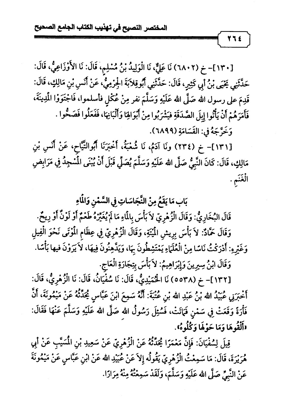 [132]- خ (5538) نَا الْحُمَيْدِيُّ، قَالَ: نَا سُفْيَانُ، قَالَ: نَا الْزُهْرِيُّ، قَالَ: أَخْبَرَنِي عُبَيْدُ الله بْنُ عَبْدِ الله بْنِ عُتْبَةَ: أَنَّهُ سَمِعَ ابْنَ عَبَّاسٍ يُحَدِّثُهُ عَنْ مَيْمُونَةَ، أَنَّ فَأْرَةً وَقَعَتْ فِي سَمْنٍ فَمَاتَتْ، فَسُئِلَ رَسُولُ اللهِ صَلَّى الله عَلَيْهِ وَسَلَّمَ عَنْهَا فَقَالَ: «أَلْقُوهَا وَمَا حَوْلَهَا وَكُلُوهُ».