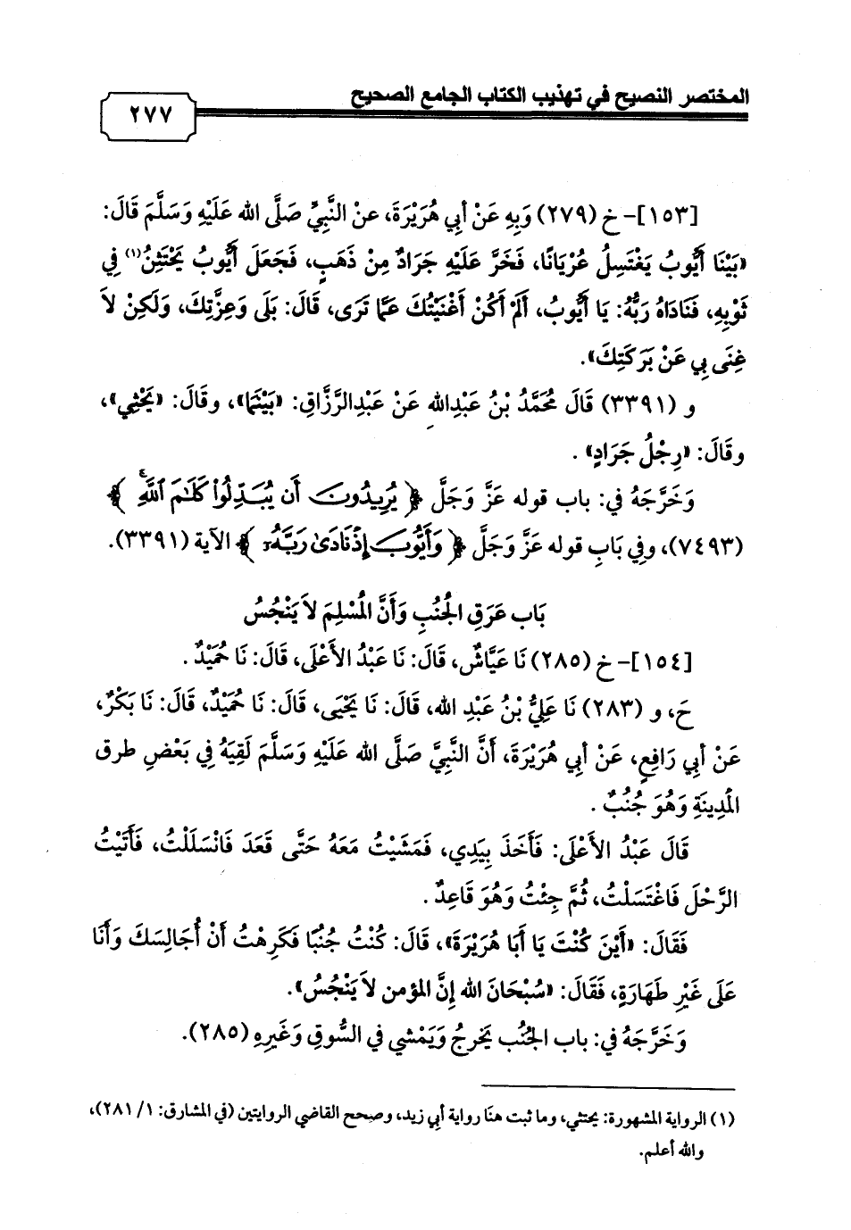 [153]- خ (279) وَبِهِ عَنْ أبِي هُرَيْرَةَ، عنْ النَّبِيِّ صَلَّى الله عَلَيْهِ وَسَلَّمَ قَالَ: «بَيْنَا أَيُّوبُ يَغْتَسِلُ عُرْيَانًا، فَخَرَّ عَلَيْهِ جَرَادٌ مِنْ ذَهَبٍ، فَجَعَلَ أَيُّوبُ يَحْتَثِنُ (¬1) فِي ثَوْبِهِ، فَنَادَاهُ رَبُّهُ: يَا أَيُّوبُ، أَلَمْ أَكُنْ أَغْنَيْتُكَ عَمَّا تَرَى، قَالَ: بَلَى وَعِزَّتِكَ، وَلَكِنْ لاَ غِنَى بِي عَنْ بَرَكَتِكَ».