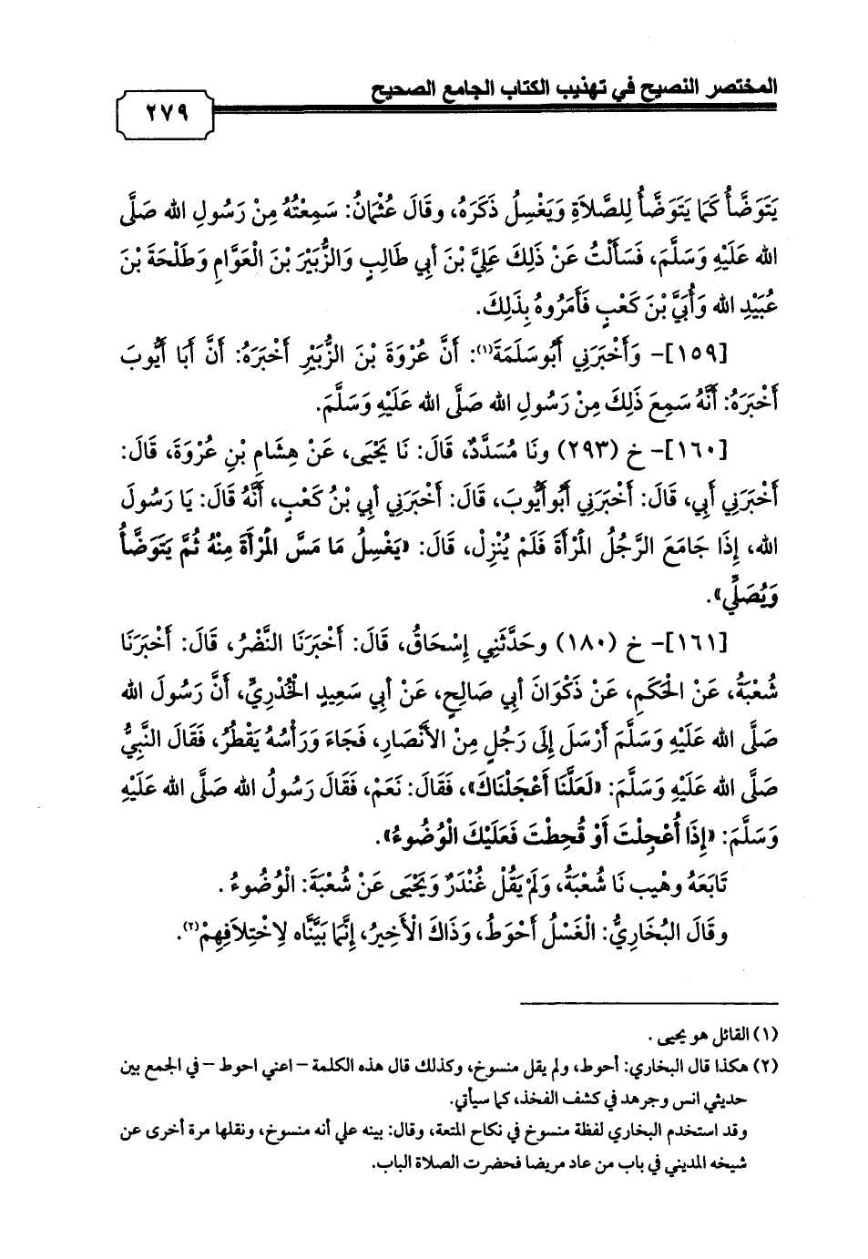 [161]- خ (180) وحَدَّثَنِي إِسْحَاقُ، قَالَ: أَخْبَرَنَا النَّضْرُ، قَالَ: أَخْبَرَنَا شُعْبَةُ، عَنْ الْحَكَمِ، عَنْ ذَكْوَانَ أبِي صَالِحٍ، عَنْ أبِي سَعِيدٍ الْخُدْرِيِّ، أَنَّ رَسُولَ الله صَلَّى الله عَلَيْهِ وَسَلَّمَ أَرْسَلَ إِلَى رَجُلٍ مِنْ الأَنْصَارِ، فَجَاءَ وَرَأْسُهُ يَقْطُرُ، فَقَالَ النَّبِيُّ صَلَّى الله عَلَيْهِ وَسَلَّمَ: «لَعَلَّنَا أَعْجَلْنَاكَ»، فَقَالَ: نَعَمْ، فَقَالَ رَسُولُ الله صَلَّى الله عَلَيْهِ وَسَلَّمَ: «إِذَا أُعْجِلْتَ أَوْ قُحِطْتَ فَعَلَيْكَ الْوُضُوءُ».