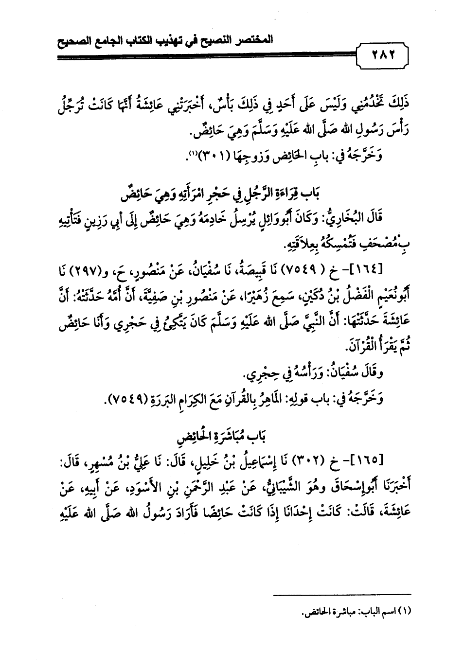 [164]- خ (7549) نَا قَبِيصَةُ، نَا سُفْيَانُ، عَنْ مَنْصُورٍ، حَ, و (297) نَا أَبُونُعَيْمٍ الْفَضْلُ بْنُ دُكَيْنٍ، سَمِعَ زُهَيْرًا، عَنْ مَنْصُورِ بْنِ صَفِيَّةَ، أَنَّ أُمَّهُ حَدَّثَتْهُ: أَنَّ عَائِشَةَ حَدَّثَتْهَا: أَنَّ النَّبِيَّ صَلَّى الله عَلَيْهِ وَسَلَّمَ كَانَ يَتَّكِئُ فِي حَجْرِي وَأَنَا حَائِضٌ ثُمَّ يَقْرَأُ الْقُرْآنَ.