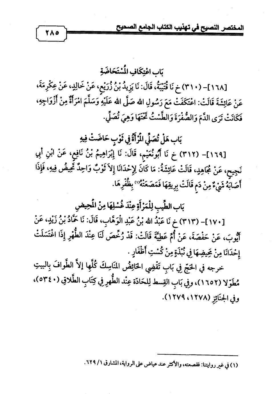 [168]- (310) خ نَا قُتَيْبَةُ، قَالَ: نَا يَزِيدُ بْنُ زُرَيْعٍ، عَنْ خَالِدٍ، عَنْ عِكْرِمَةَ، عَنْ عَائِشَةَ قَالَتْ: اعْتَكَفَتْ مَعَ رَسُولِ الله صَلَّى الله عَلَيْهِ وَسَلَّمَ امْرَأَةٌ مِنْ أَزْوَاجِهِ، فَكَانَتْ تَرَى الدَّمَ وَالصُّفْرَةَ وَالطَّسْتُ تَحْتَهَا وَهِيَ تُصَلِّي.