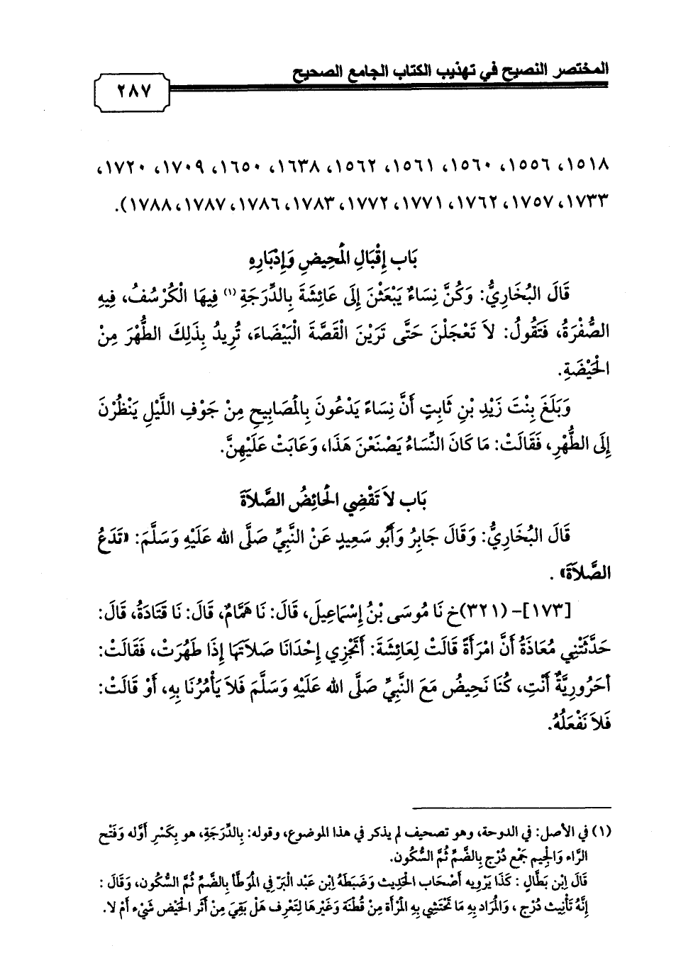 [173]- (321) خ نَا مُوسَى بْنُ إِسْمَاعِيلَ، قَالَ: نَا هَمَّامٌ، قَالَ: نَا قَتَادَةُ، قَالَ: حَدَّثَتْنِي مُعَاذَةُ أَنَّ امْرَأَةً قَالَتْ لِعَائِشَةَ: أَتَجْزِي إِحْدَانَا صَلاَتَهَا إِذَا طَهُرَتْ، فَقَالَتْ: أحَرُورِيَّةٌ أَنْتِ، كُنَا نَحِيضُ مَعَ النَّبِيِّ صَلَّى الله عَلَيْهِ وَسَلَّمَ فَلاَ يَأْمُرُنَا بِهِ، أَوْ قَالَتْ: فَلاَ نَفْعَلُهُ.