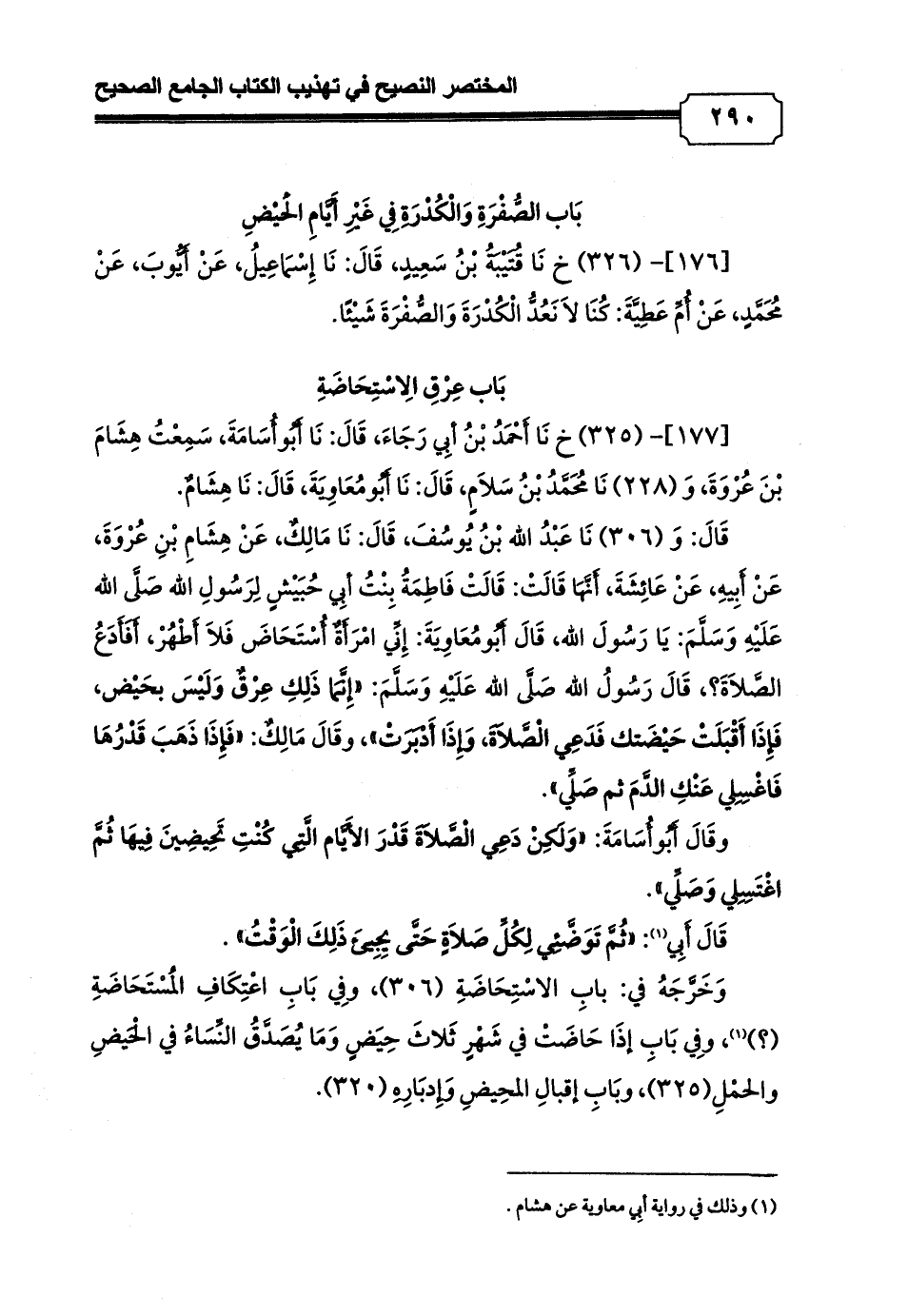 قَالَ: وَ (306) نَا عَبْدُ الله بْنُ يُوسُفَ، قَالَ: نَا مَالِكٌ، عَنْ هِشَامِ بْنِ عُرْوَةَ، عَنْ أَبِيهِ، عَنْ عَائِشَةَ، أَنَّهَا قَالَتْ: قَالَتْ فَاطِمَةُ بِنْتُ أبِي حُبَيْشٍ لِرَسُولِ الله صَلَّى الله عَلَيْهِ وَسَلَّمَ: يَا رَسُولَ الله, قَالَ أَبُومُعَاوِيَةَ: إِنِّي امْرَأَةٌ أُسْتَحَاضَ فَلاَ أَطْهُرْ، أَفَأَدَعُ الصَّلاَةَ؟، قَالَ رَسُولُ الله صَلَّى الله عَلَيْهِ وَسَلَّمَ: «إِنَّمَا ذَلِكِ عِرْقٌ وَلَيْسَ بحَيْض، فَإِذَا أَقْبَلَتْ حَيْضَتك فَدَعِي الْصَّلاَةَ, وَإِذَا أَدْبَرَتْ»، وقَالَ مَالِكٌ: «فَإِذَا ذَهَبَ قَدْرُهَا فَاغْسِلِي عَنْكِ الدَّمَ ثم صَلِّي».